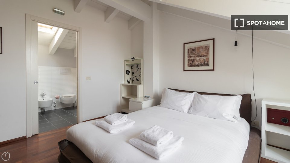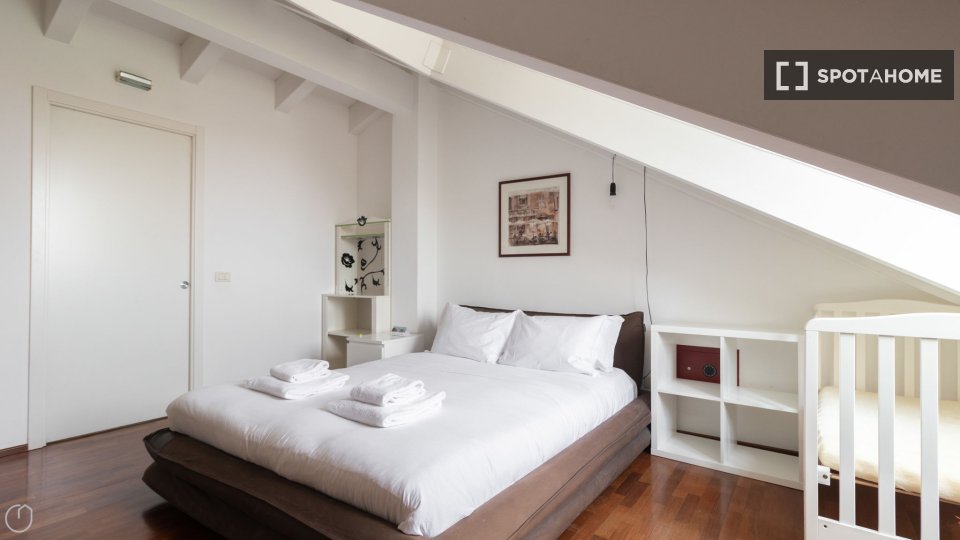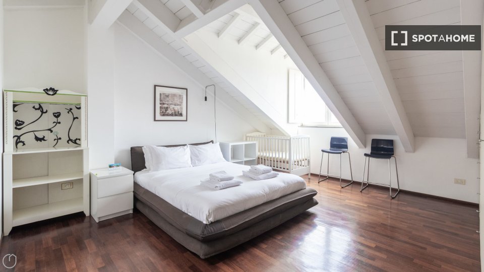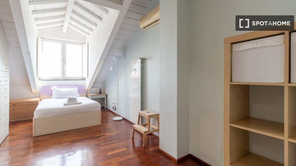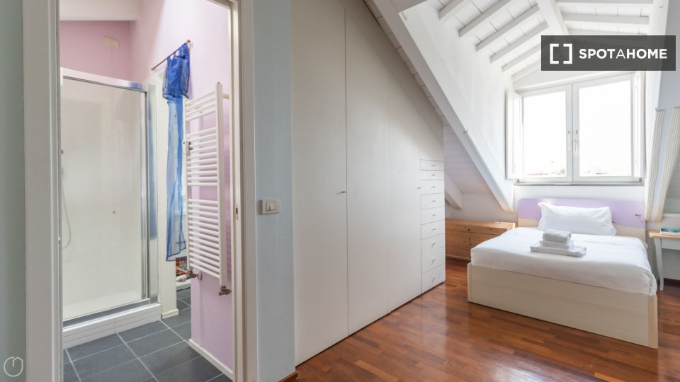 Questa spaziosa camera in un appartamento condiviso con 5 camere da letto ad Aurelio Sud è rivolta verso l'esterno ed è completamente arredata per garantire un soggiorno confortevole. Godetevi servizi come aria condizionata centralizzata, lavatric...
