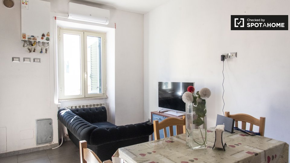 Questo monolocale arredato a Tuscolano Nord offre aria condizionata autonoma, riscaldamento centralizzato e una cucina ben attrezzata con lavastoviglie e forno. L'alloggio dispone di balcone o terrazza e di una lavatrice comune in loco. È vietato ...