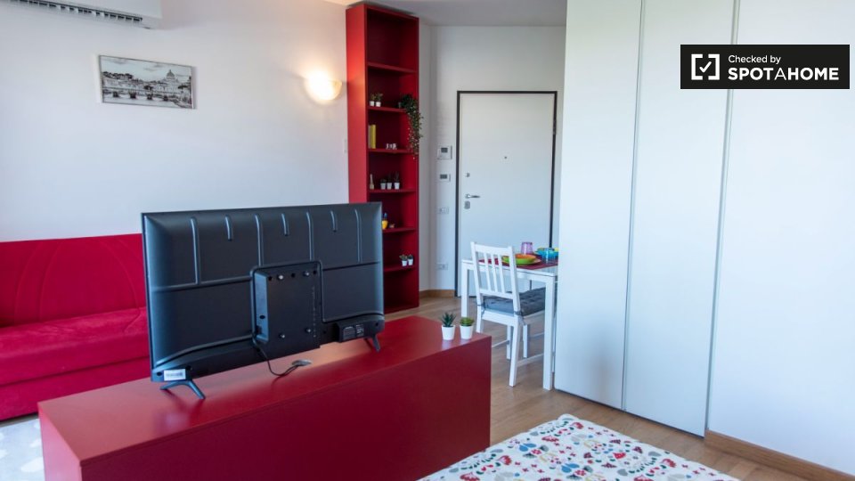 Questo monolocale con vista esterna, situato a Casal Bruciato, Roma, offre uno spazio abitativo accogliente e moderno. È completamente arredato e comprende una cucina attrezzata con elettrodomestici essenziali come lavastoviglie, forno e TV. L'imm...