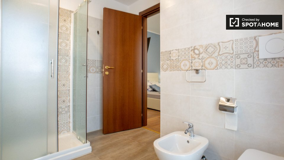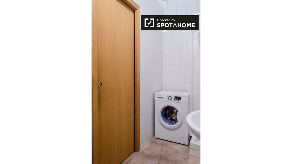 Questo appartamento condiviso con 6 camere da letto si trova nel quartiere E.U.R. di Roma. L'immobile è arredato e offre servizi come una cucina completamente attrezzata, lavatrice privata e balcone. Tutte le utenze (elettricità, acqua, gas e Wi-F...