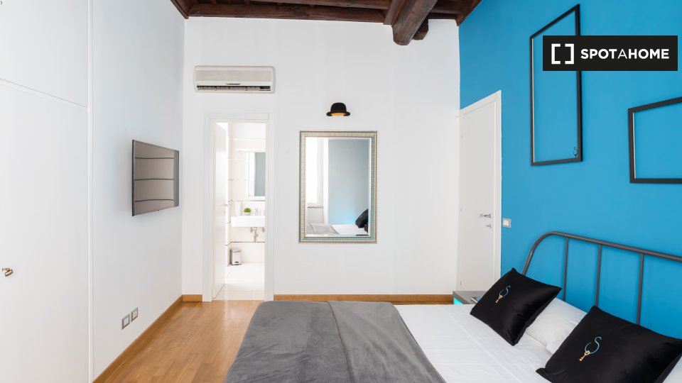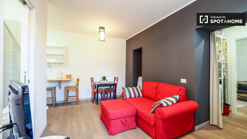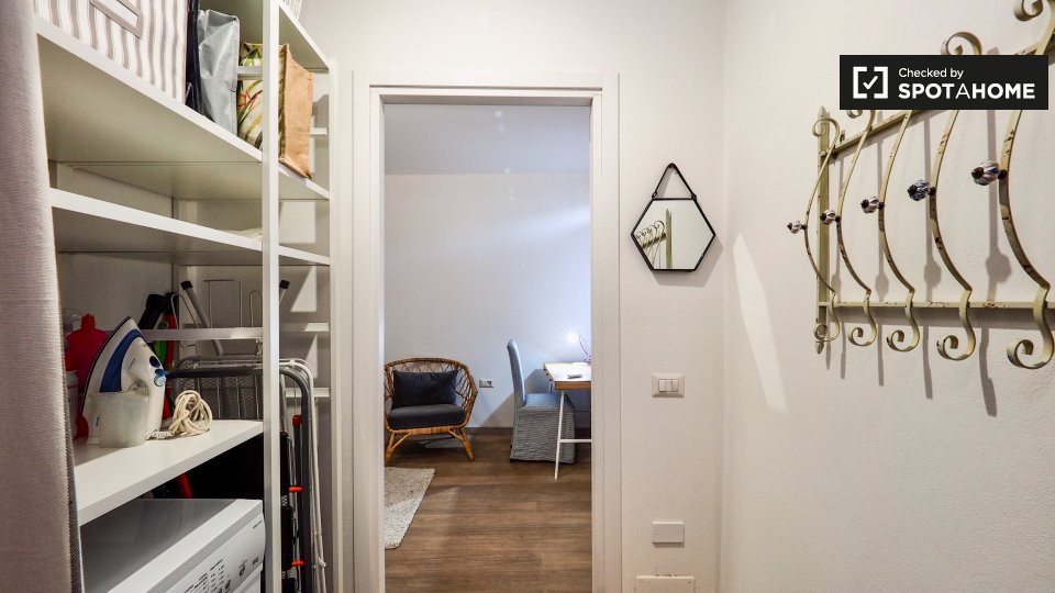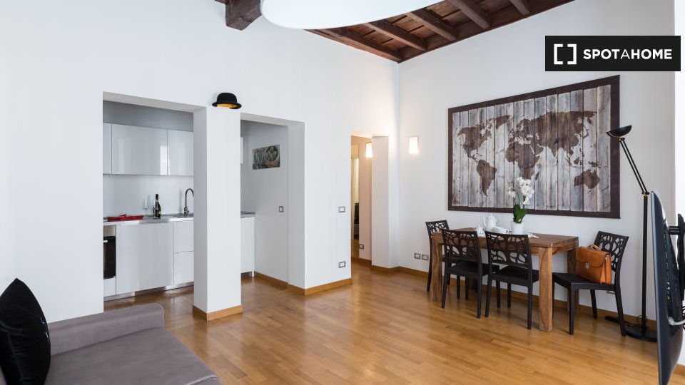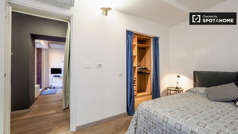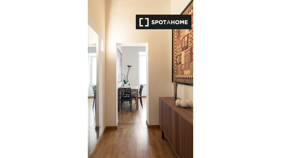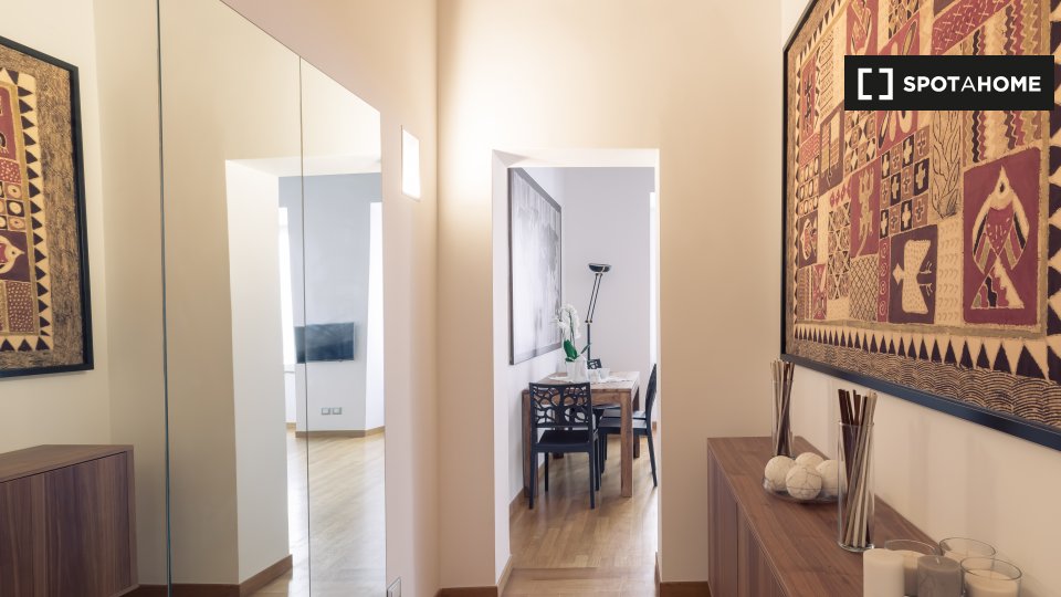 Questo appartamento arredato con una camera da letto nel Rione Monti, a Roma, offre comfort moderni come aria condizionata regolabile autonomamente, cucina attrezzata e lavanderia privata. L'appartamento si affaccia sull'esterno e include servizi ...