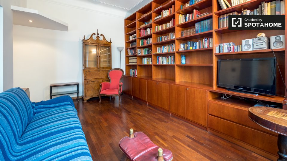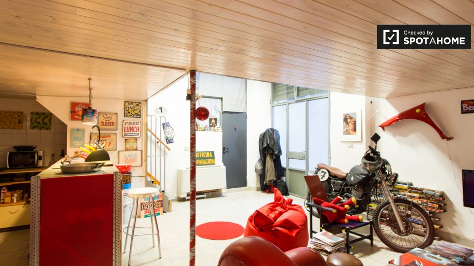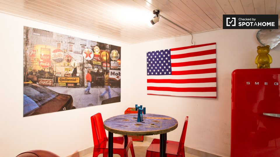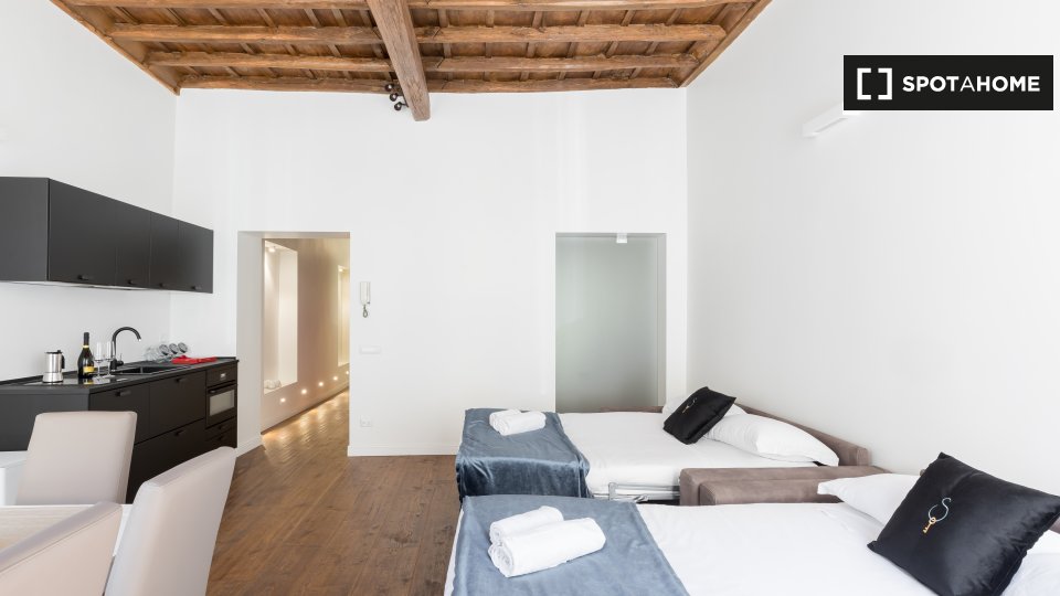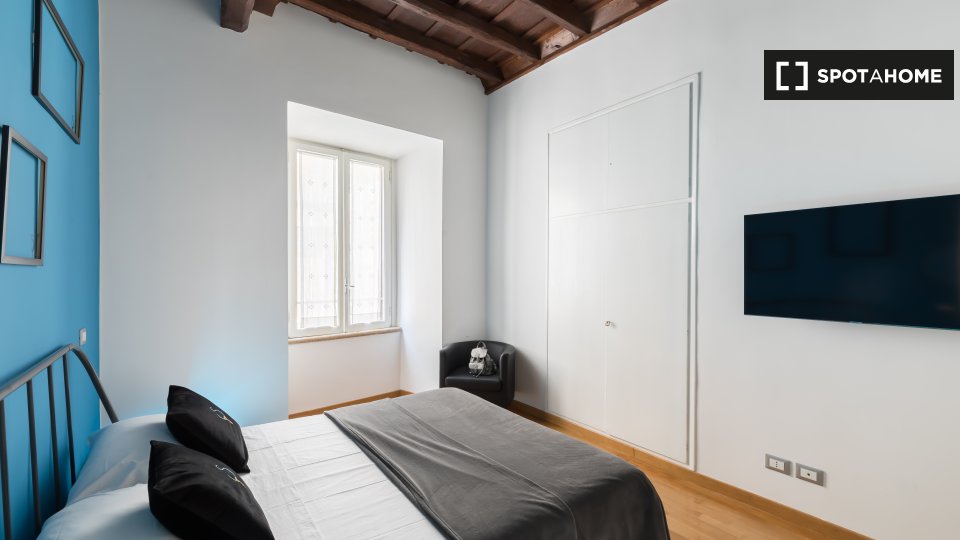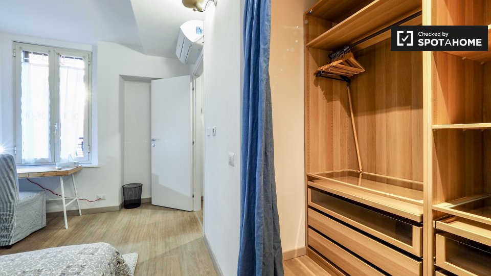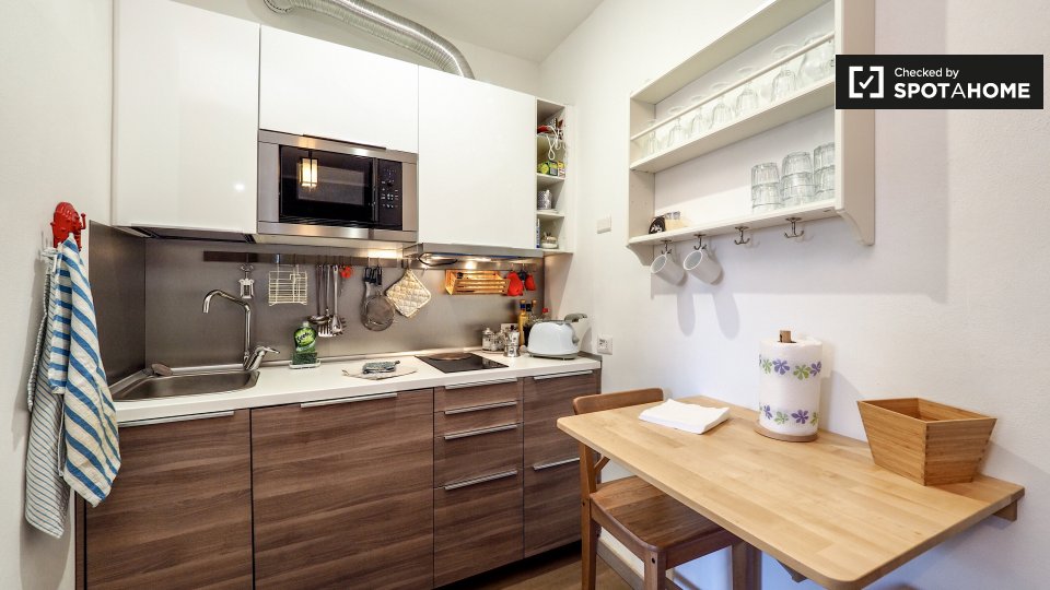 Questo appartamento arredato con una camera da letto nel Rione Monti, a Roma, offre comfort moderni come aria condizionata regolabile autonomamente, cucina attrezzata e lavanderia privata. L'appartamento si affaccia sull'esterno e include servizi ...