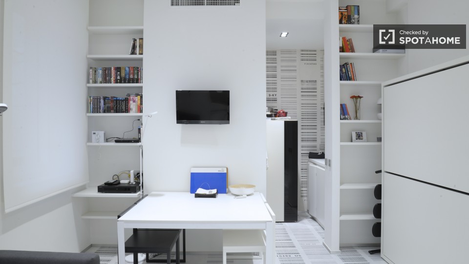 Un design-led monolocale, ben arredato con mobili prevalentemente bianchi e gli accessori, creando un look molto pulito e raffinato. Questo piccolo 35 mq piatto fa ottimo uso dello spazio esistente per creare una casa completamente funzionale. Con...