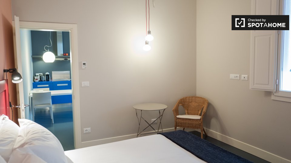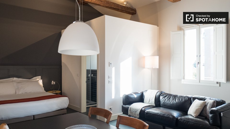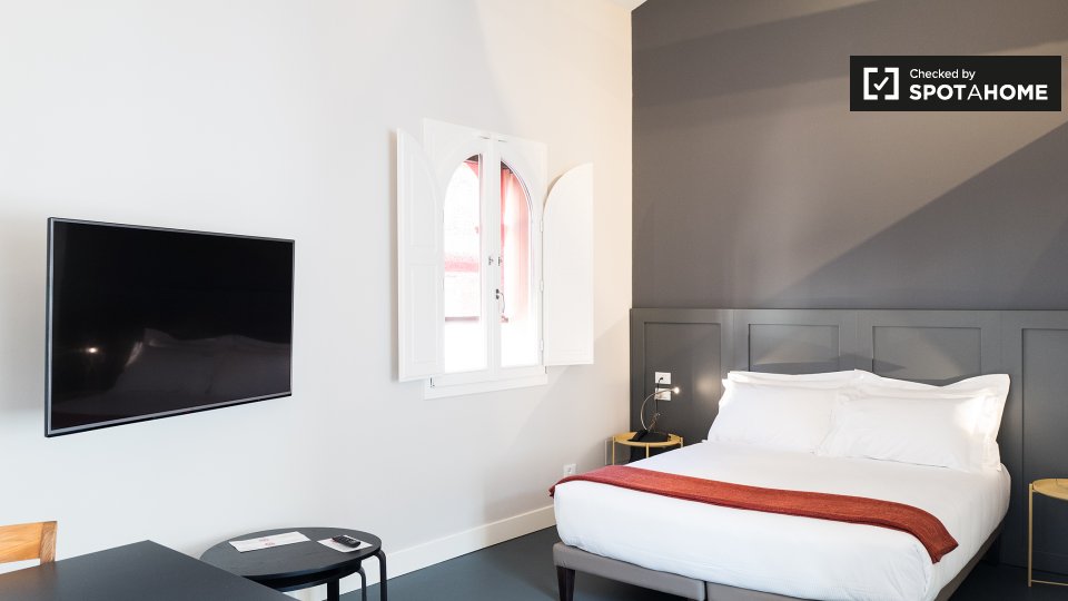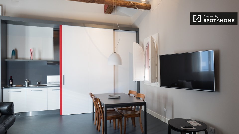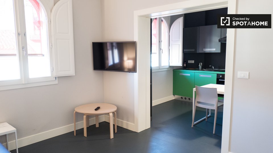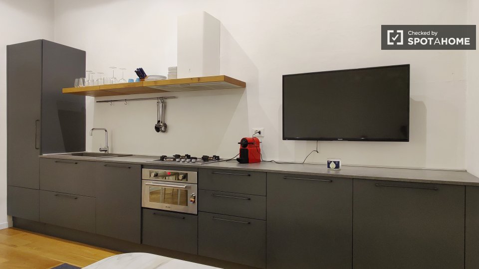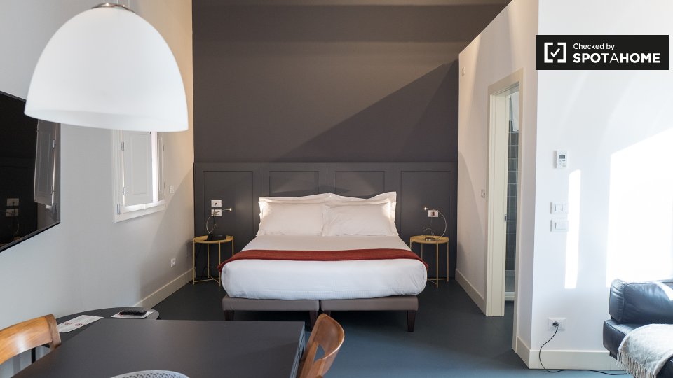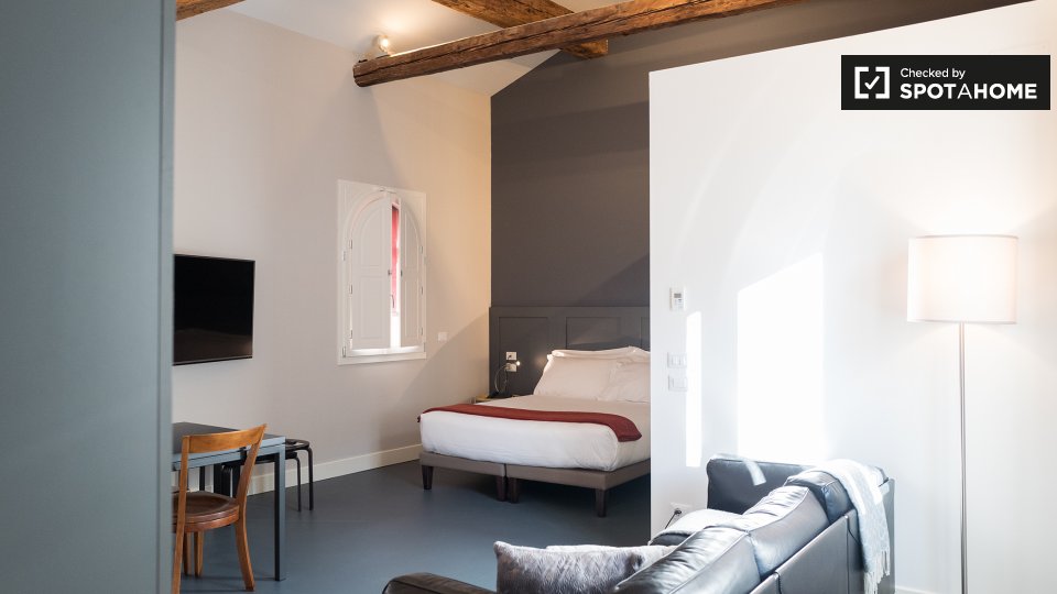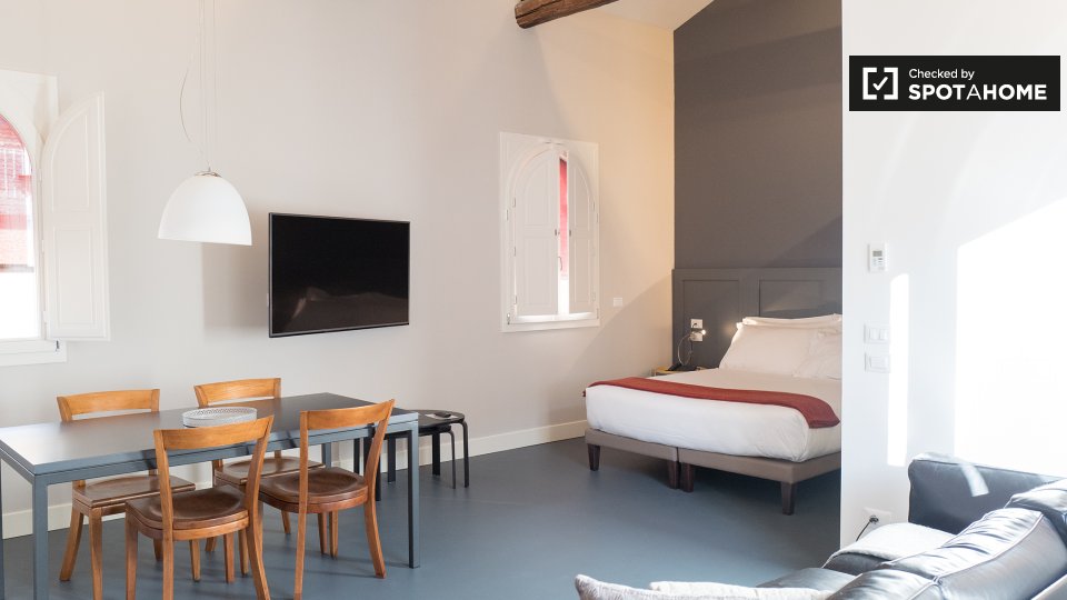 Questo monolocale di 43 m² è disponibile in affitto a Irnerio, Bologna. La stanza principale ospita la camera da letto, il soggiorno e la cucina. C'è un letto matrimoniale, un tavolo da pranzo e sedie, e un comodo divano che si affaccia sul televi...