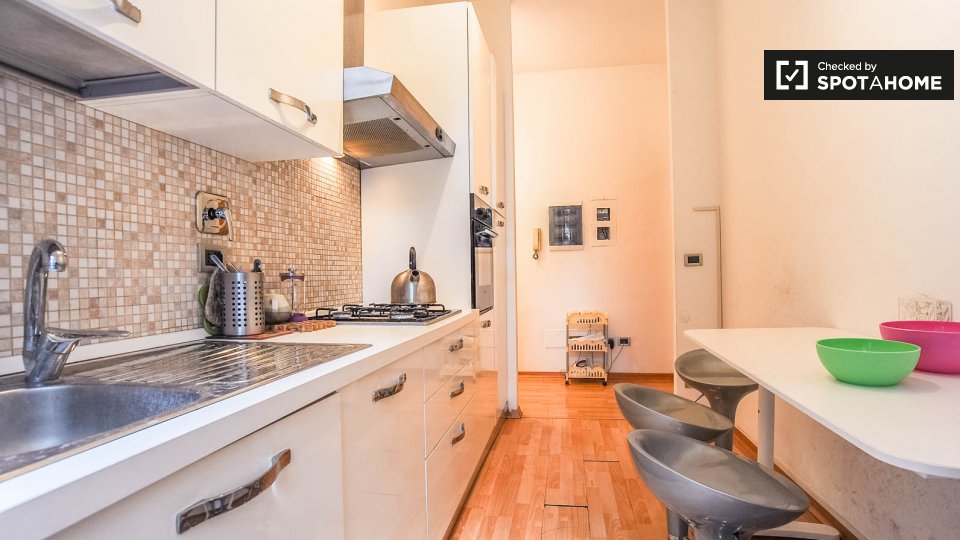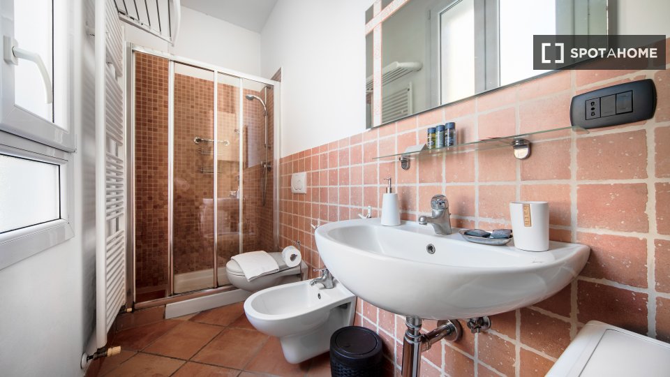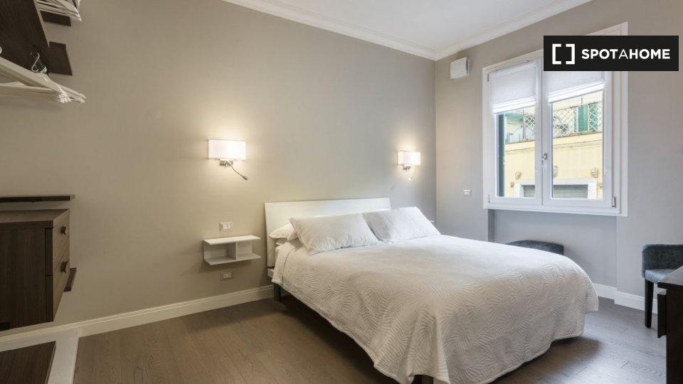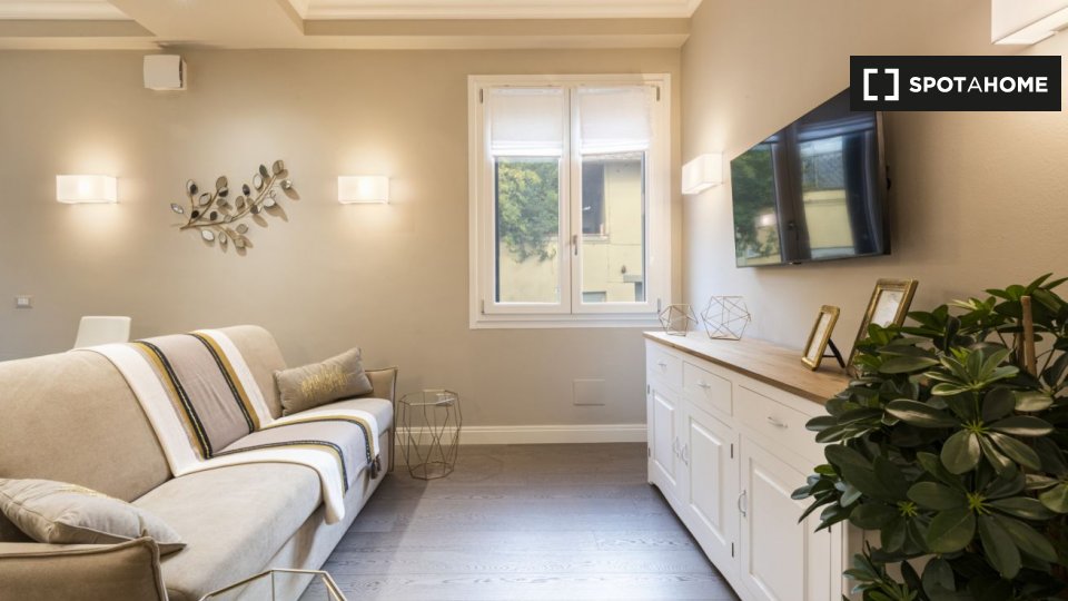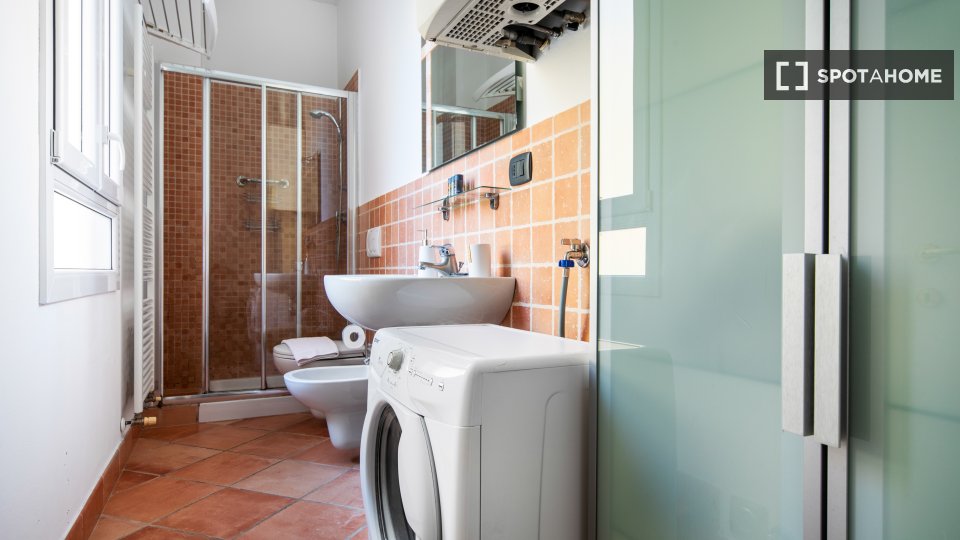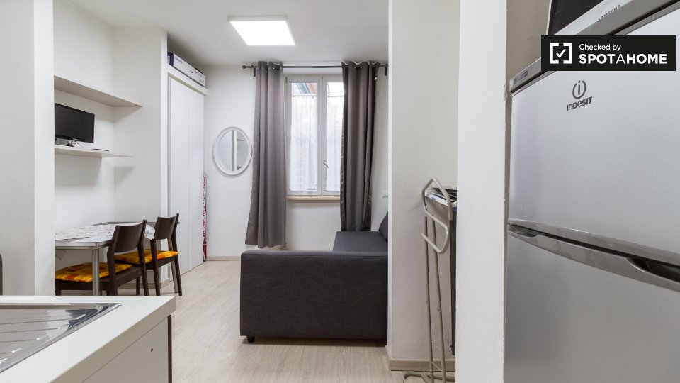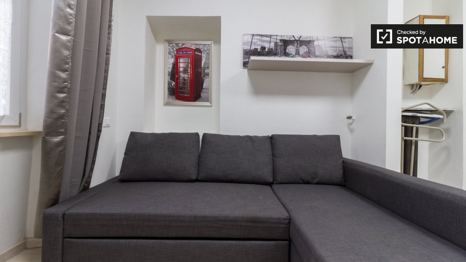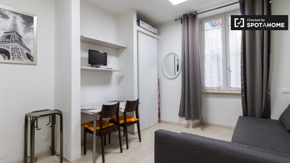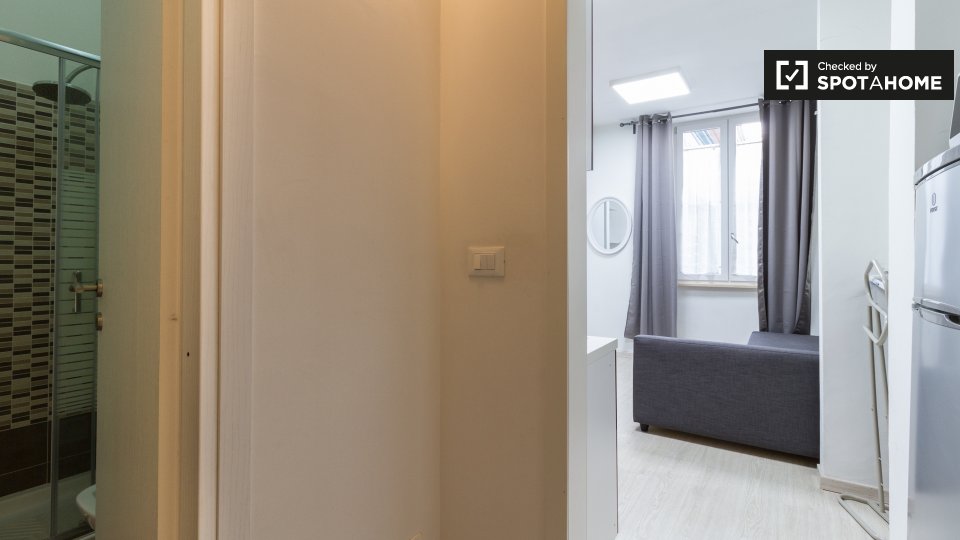 Questo studio dolce e accogliente è in affitto nella zona Prati di Roma. La zona giorno offre un comodo divano con cuscini colorati, una scrivania con due sedie e una TV a parete. Puoi anche trovare scaffalature e un armadio a questo livello. L'ac...