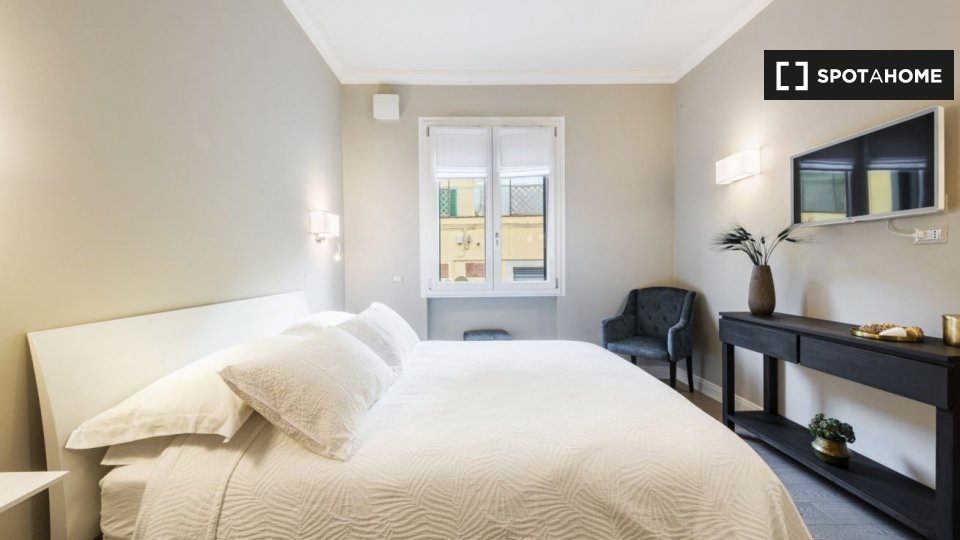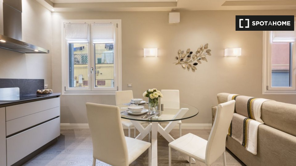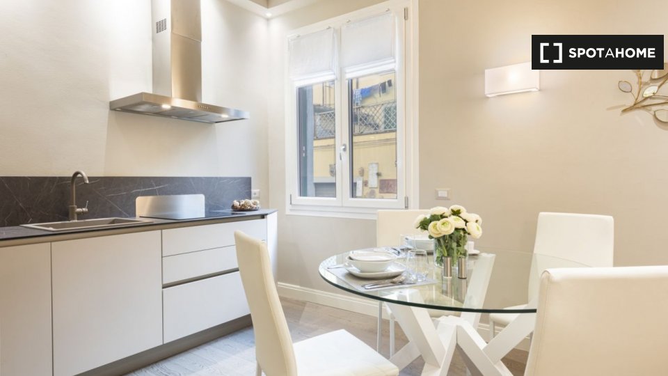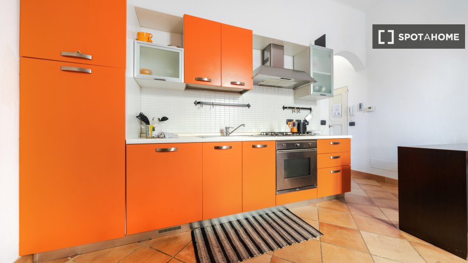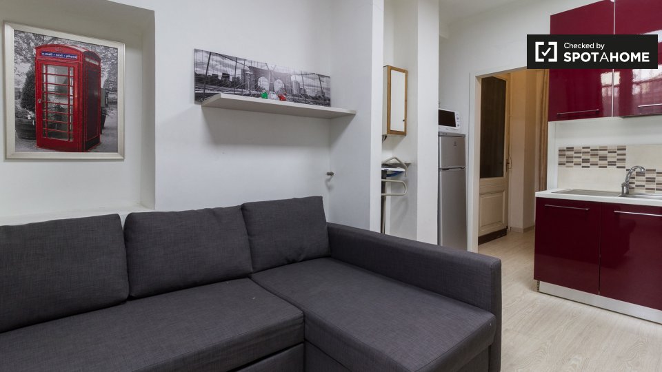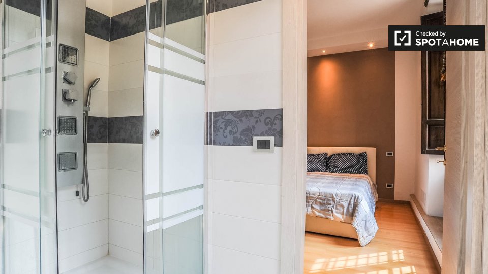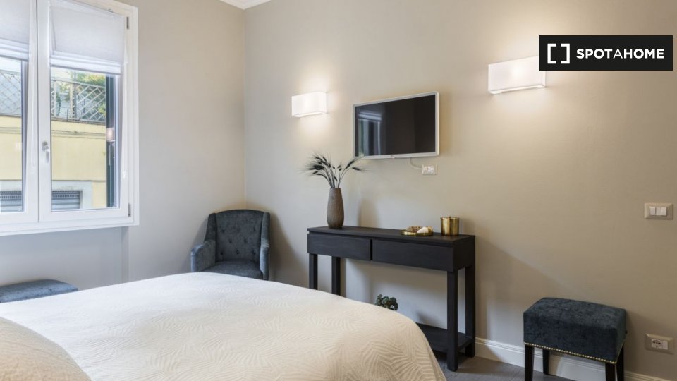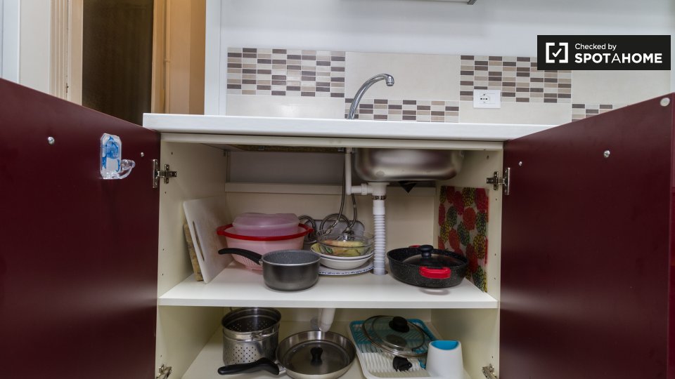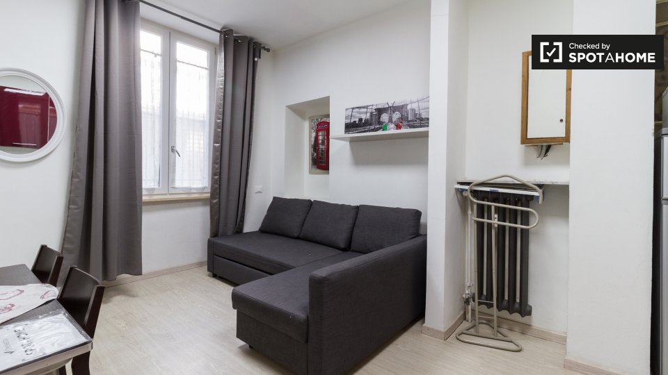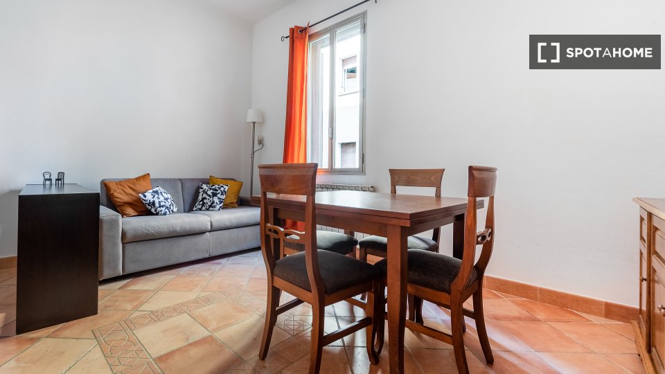 Questo studio dolce e accogliente è in affitto nella zona Prati di Roma. La zona giorno offre un comodo divano con cuscini colorati, una scrivania con due sedie e una TV a parete. Puoi anche trovare scaffalature e un armadio a questo livello. L'ac...
