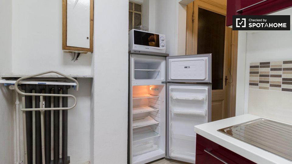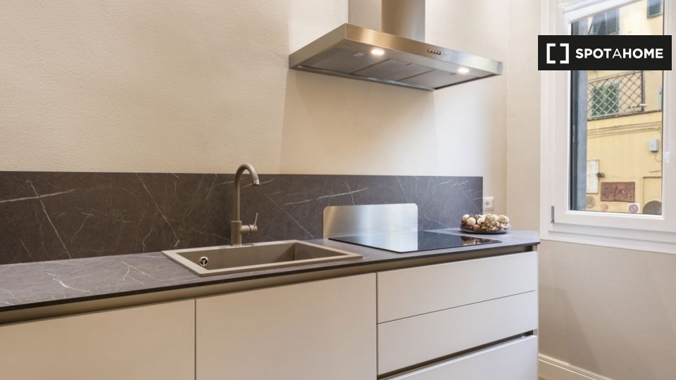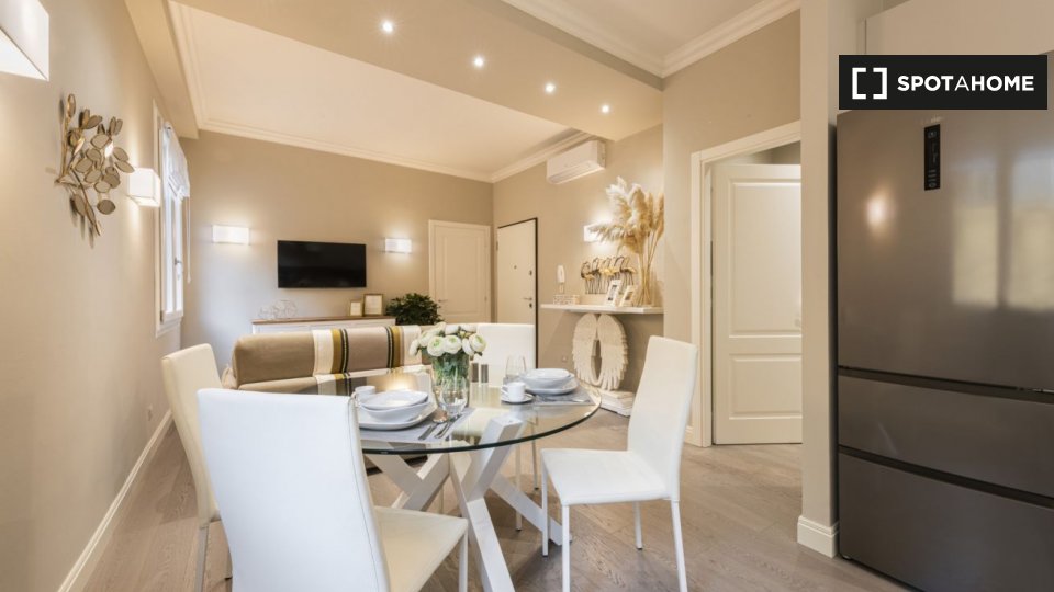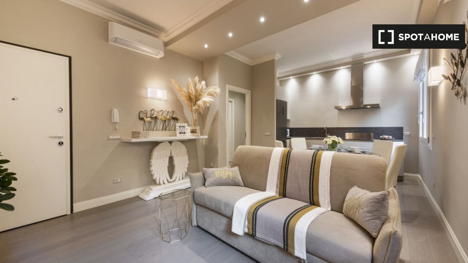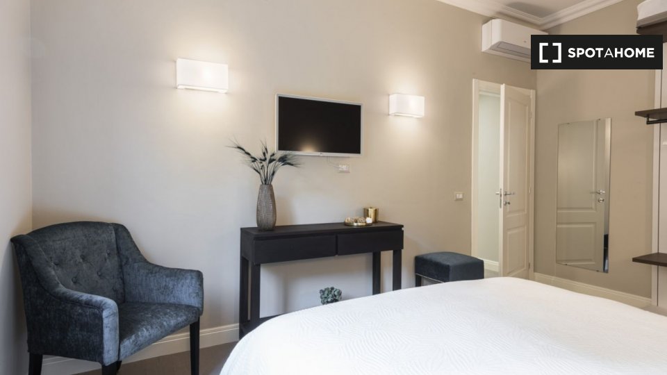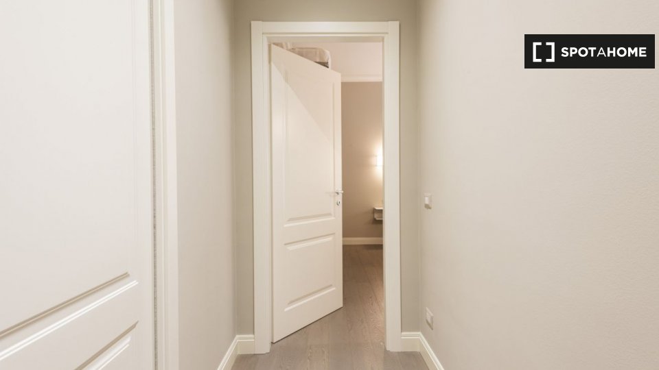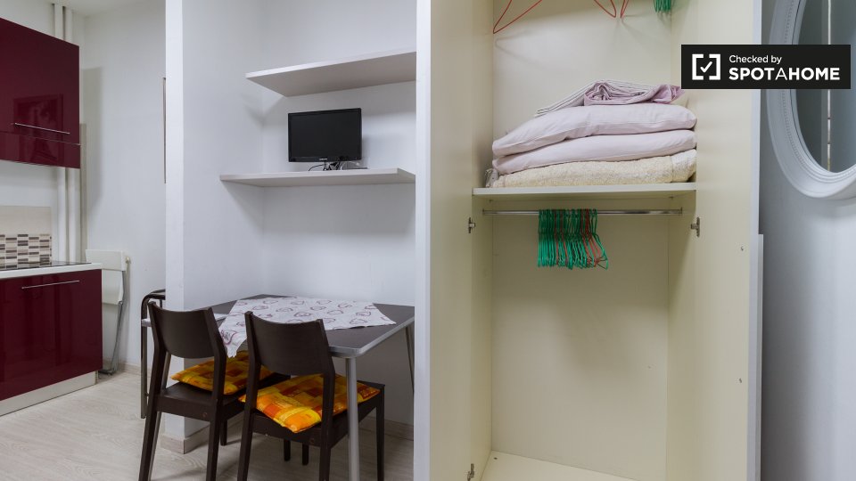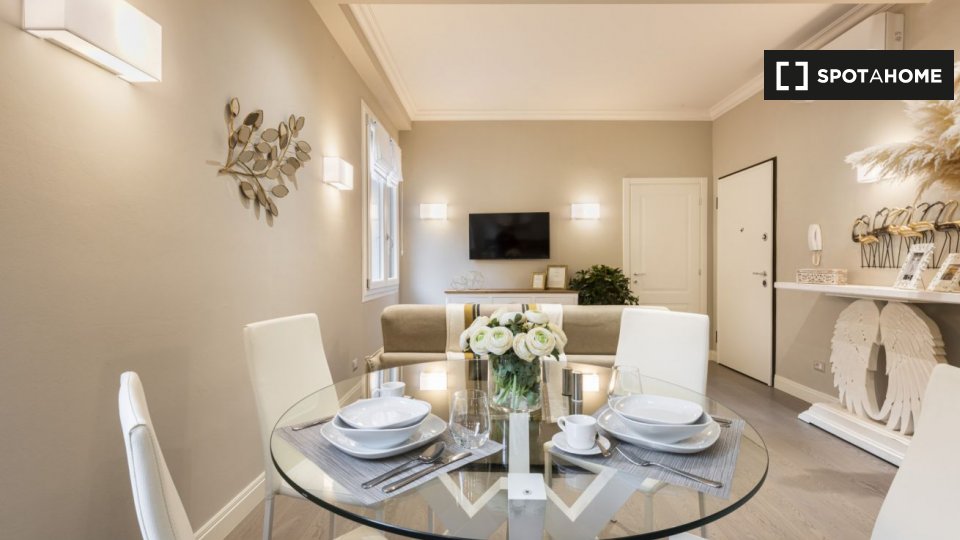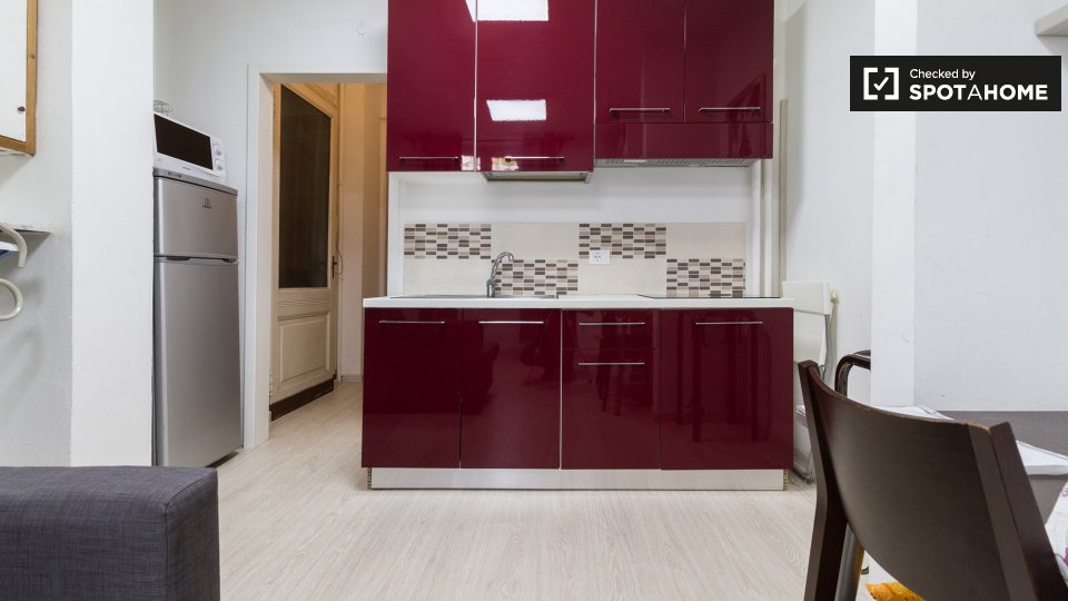 Questo studio dolce e accogliente è in affitto nella zona Prati di Roma. La zona giorno offre un comodo divano con cuscini colorati, una scrivania con due sedie e una TV a parete. Puoi anche trovare scaffalature e un armadio a questo livello. L'ac...