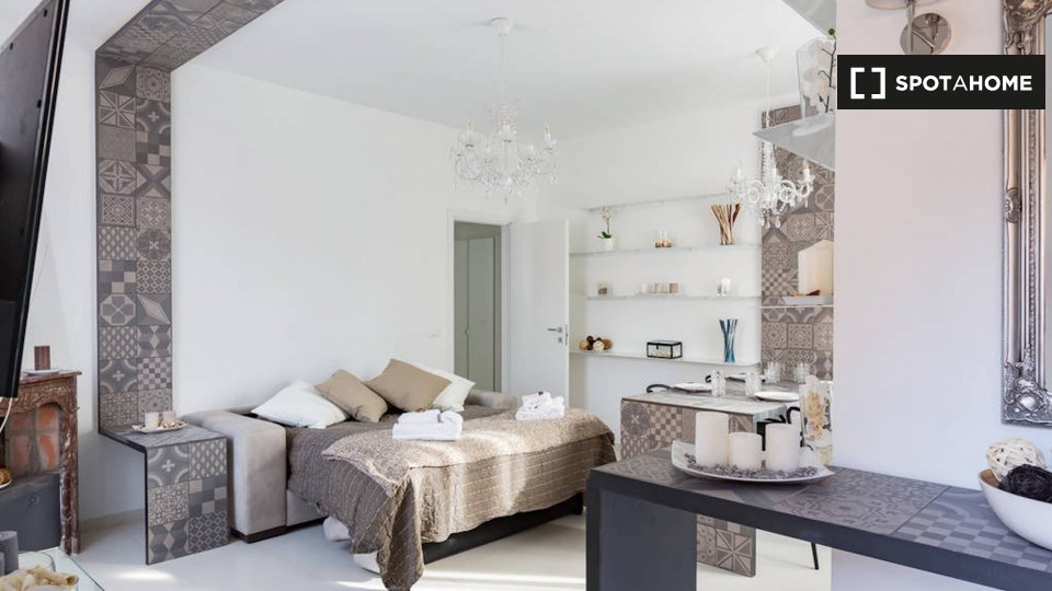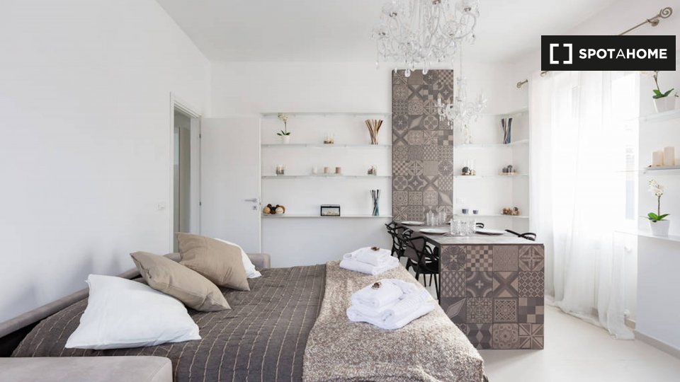 Questo delizioso monolocale di 25 m² è disponibile per l'affitto nel Centro Storico, il centro storico di Roma. La stanza principale, decorata in blu, è la camera da letto, che ha un letto matrimoniale, un piccolo tavolo da pranzo con sedie e un a...