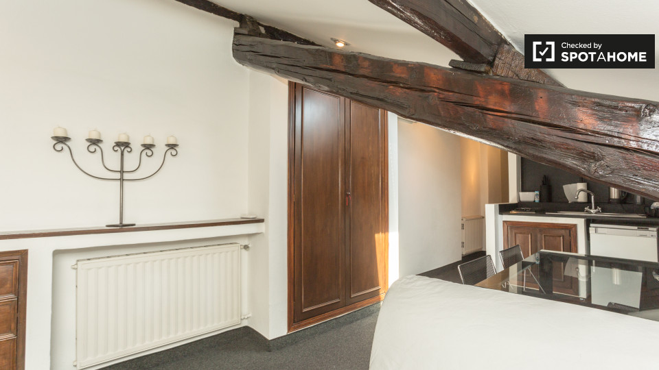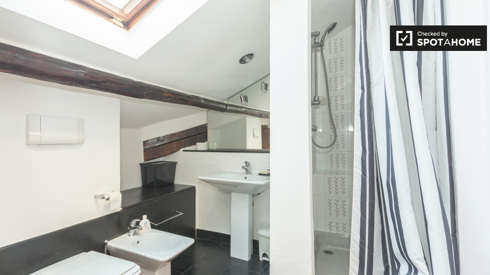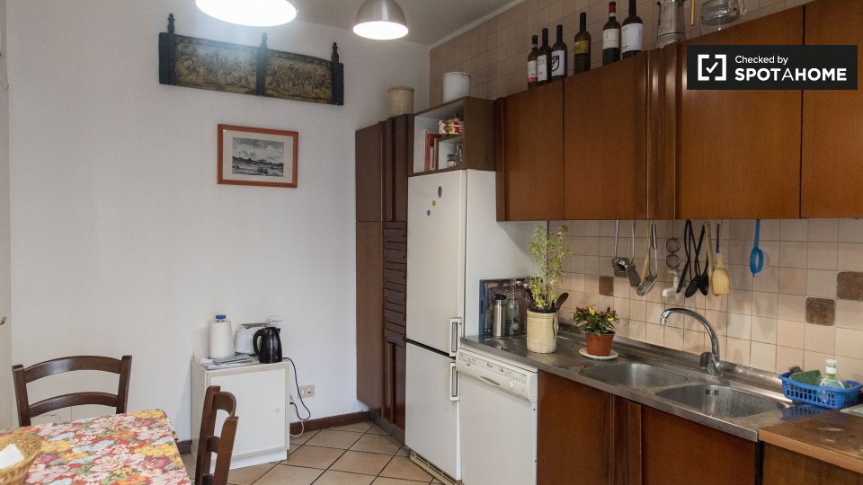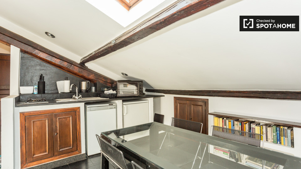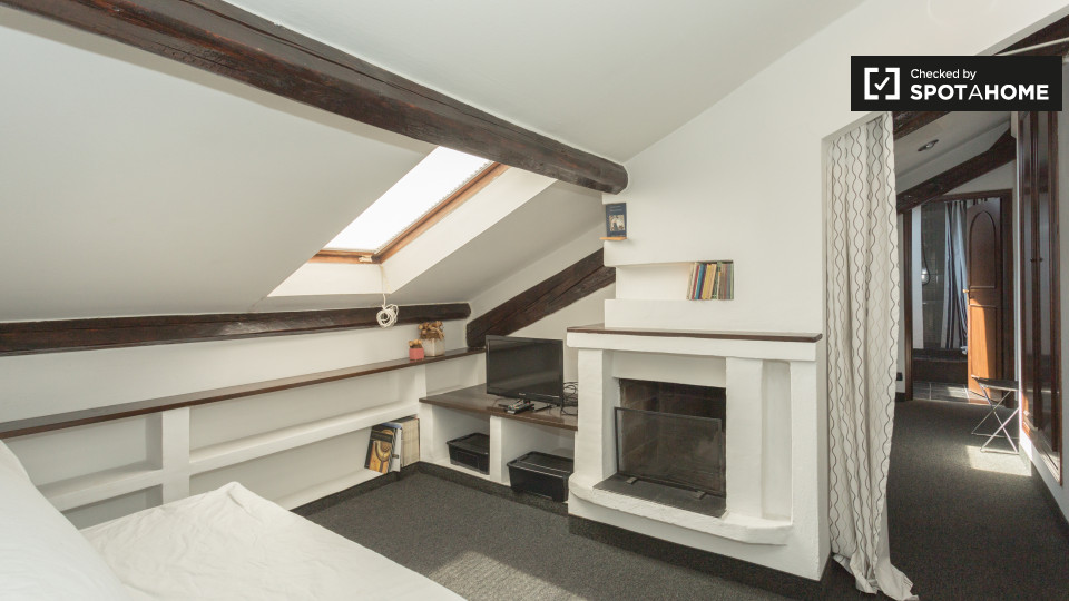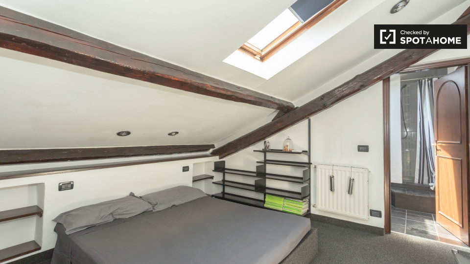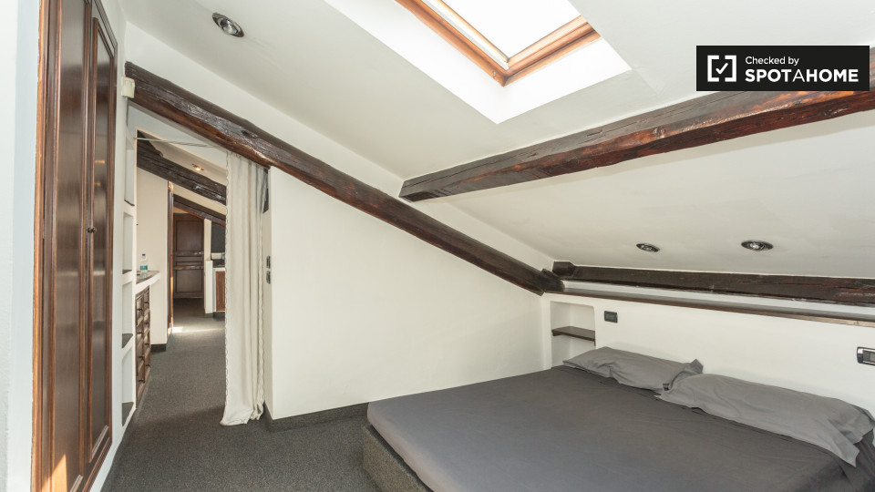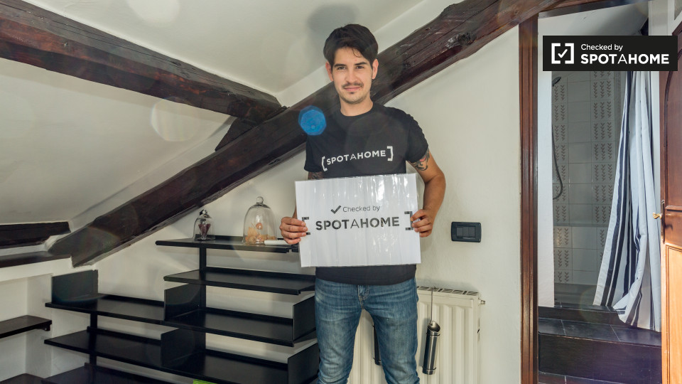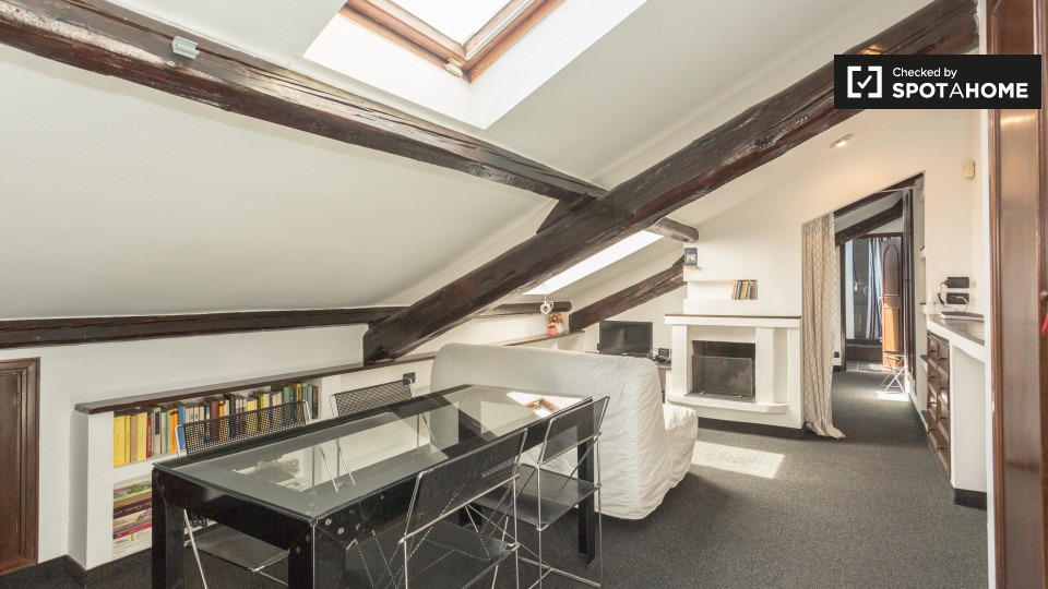 Dispone di un affascinante 50 m², 1 camera da letto in affitto vicino ai quartieri di San Siro e De Angeli. Situato al 4 ° piano, l'appartamento dispone di travi in legno rustico e di varie finestre lucernari. Il soggiorno e la cucina condividon...