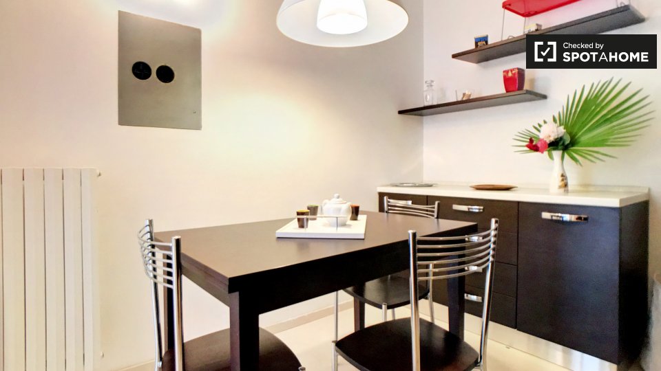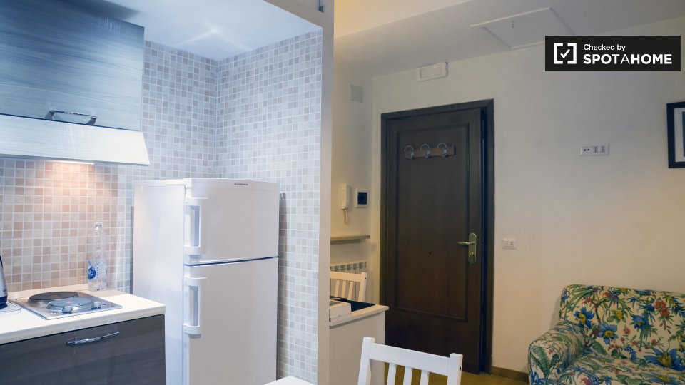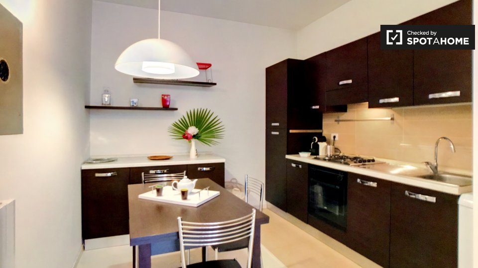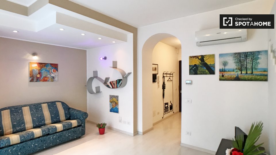 Benvenuti in questo monolocale arredato in affitto a Tomba di Nerone, Roma. Il monolocale è dotato di aria condizionata centralizzata e lavatrice privata. La cucina è completamente attrezzata e c'è un balcone a vostra disposizione. È consentito fu...