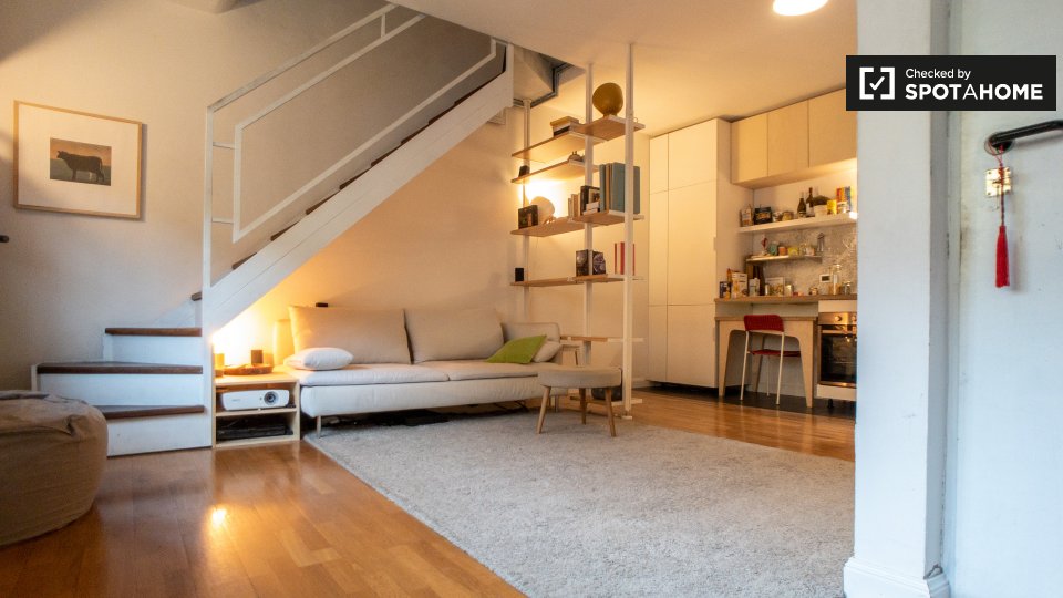 Un elegante appartamento duplex e in una zona tranquilla della città. Offre un ampio soggiorno e un'accogliente camera da letto con splendidi soffitti in legno. In questa zona tranquilla, troverai il canale e molti ristoranti e bar alla moda. Trov...