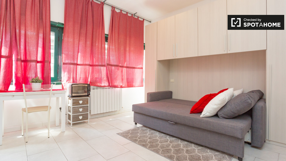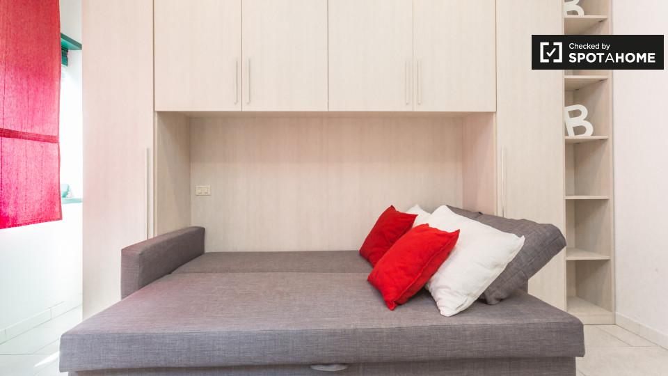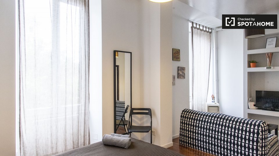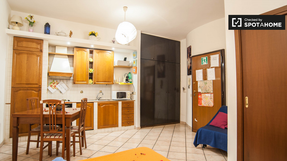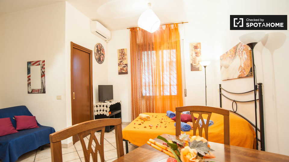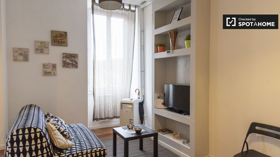 Splendido monolocale in affitto a Appio Latino. Questo appartamento ammobiliato offre tutti i comfort necessari senza sentirsi stretti. Ti piacerà il letto matrimoniale pur avendo spazio per un tavolo da pranzo e sedie ingrandibili. C'è molta scaf...