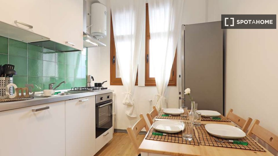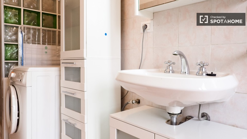 Questo luminoso appartamento di 100 mq, con 4 camere da letto, è completamente arredato e dispone di 4 camere singole in affitto per le donne. Recentemente rinnovato, l'appartamento offre camere molto ordinate e servizi comuni. C'è una grande cuci...