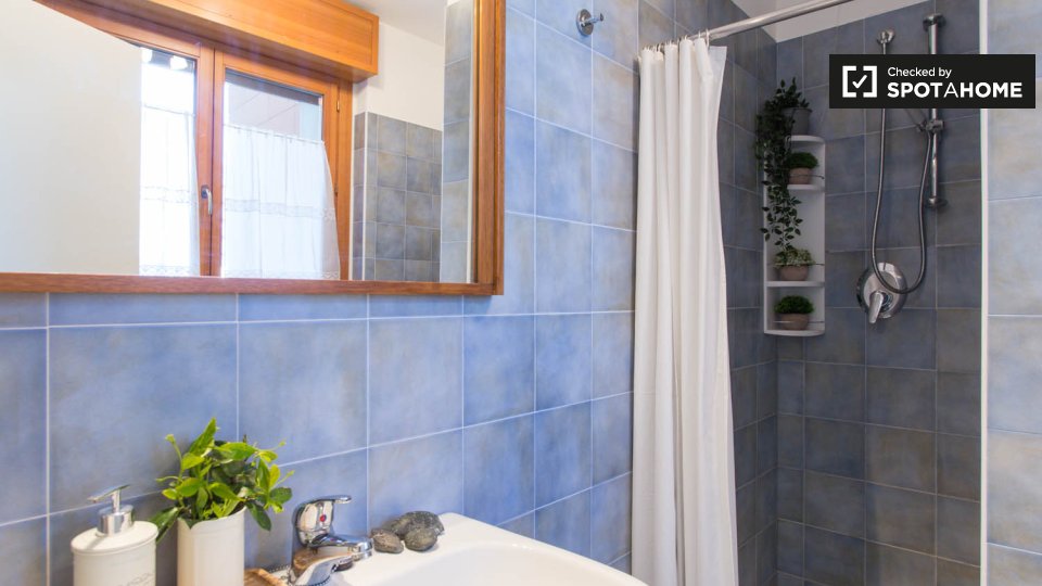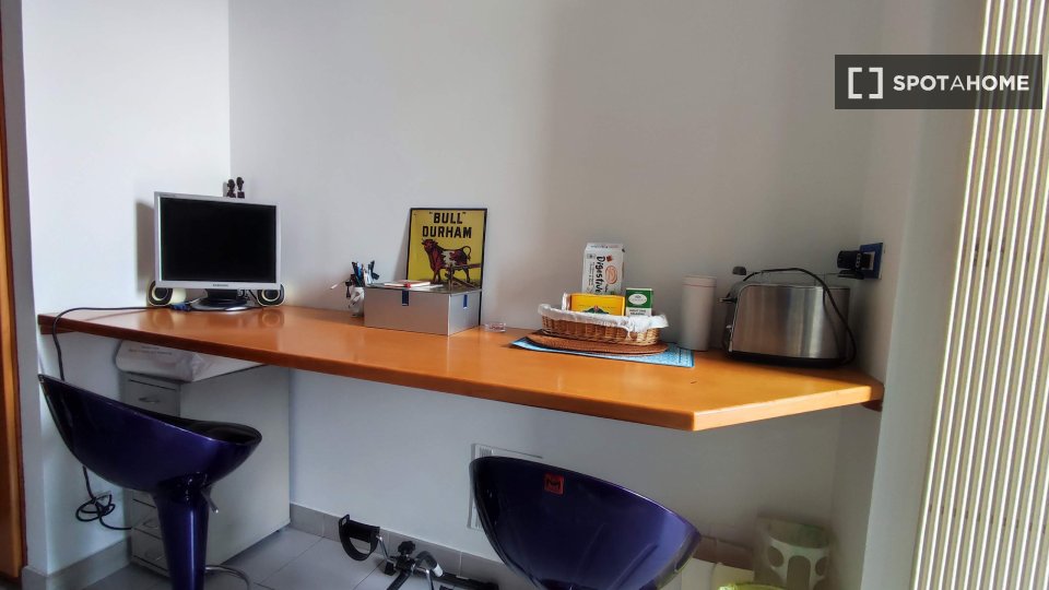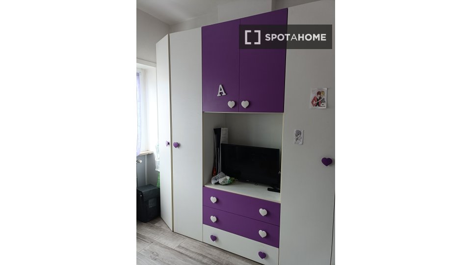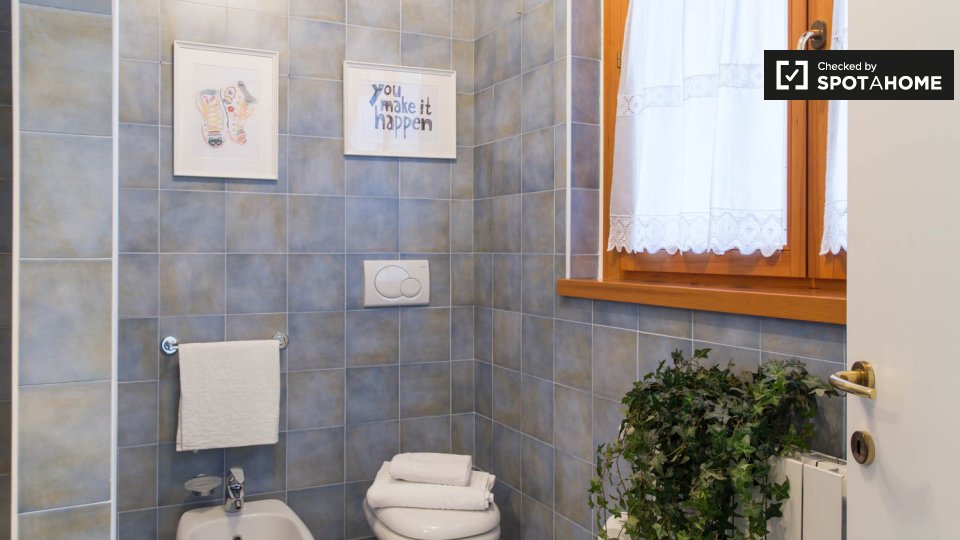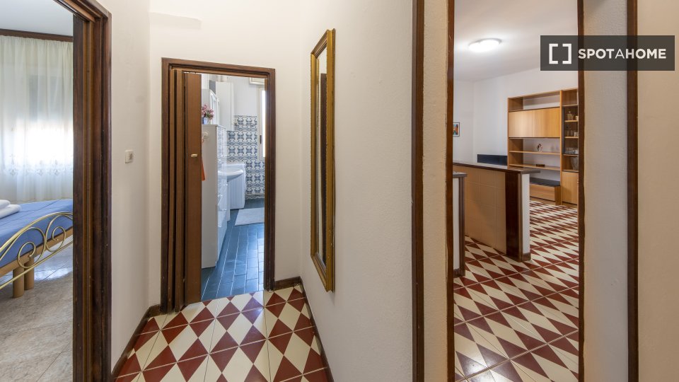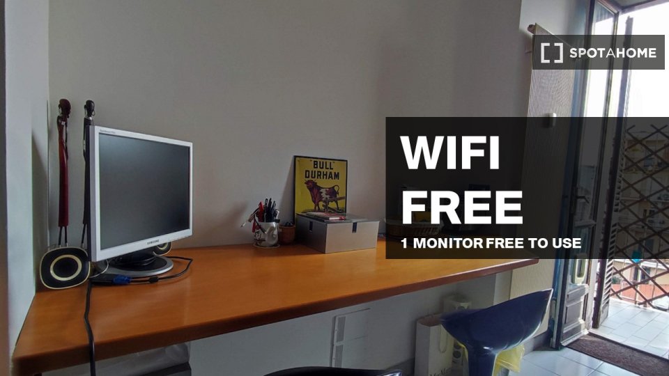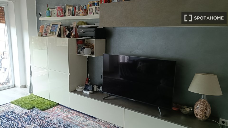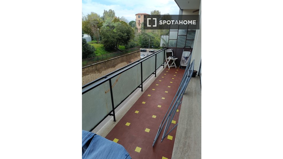 Questa camera completamente arredata in un appartamento condiviso con 5 camere da letto nel quartiere Aurelio Nord offre un balcone, riscaldamento centralizzato ed elettrodomestici moderni, come lavatrice e lavastoviglie. Tutte le utenze sono incl...