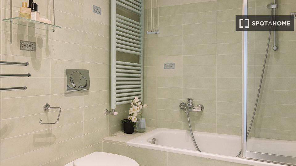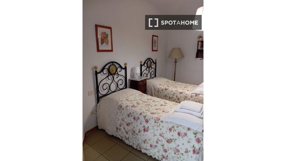 Camera doppia con due letti e bagno privato. Si trova all'interno di un miniappartamento di 42 m² con soggiorno e cucina completamente attrezzata, TV e soggiorno. La superficie della camera è di circa 21 m². La stanza è composta da una zona studio...