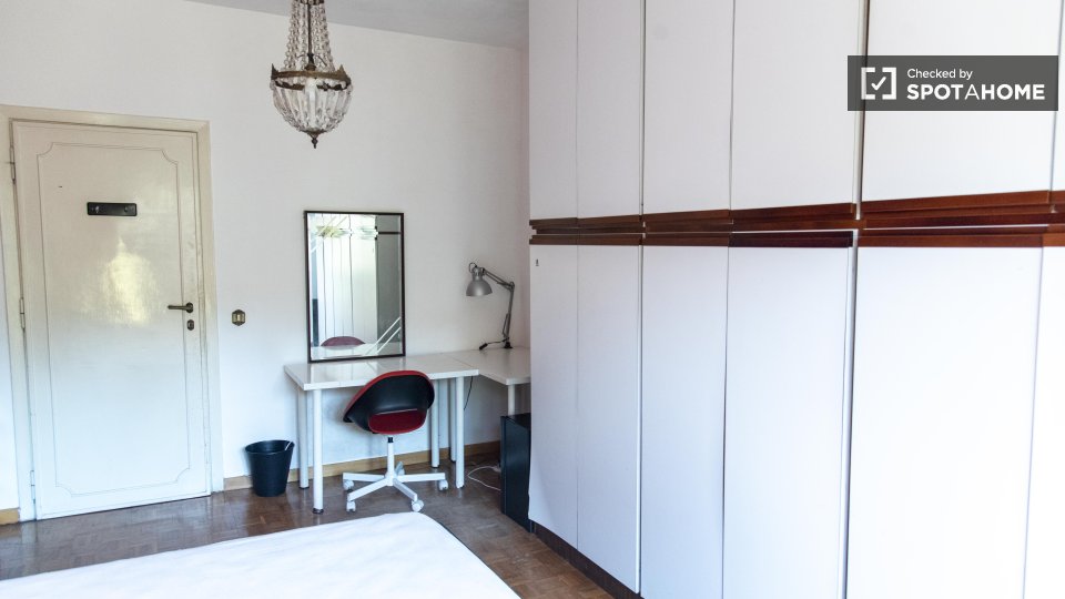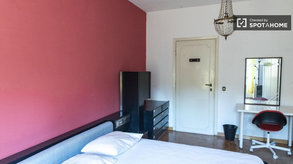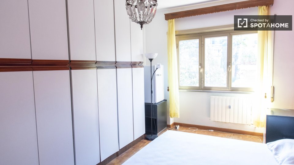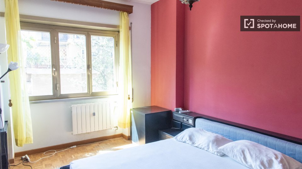 Scopri questa accogliente camera in un appartamento condiviso con 6 camere da letto situato a Monte Sacro, Roma. Arredata con cura e dotata di riscaldamento centralizzato e pratici comfort come lavatrice in comune, cucina attrezzata e balcone o te...