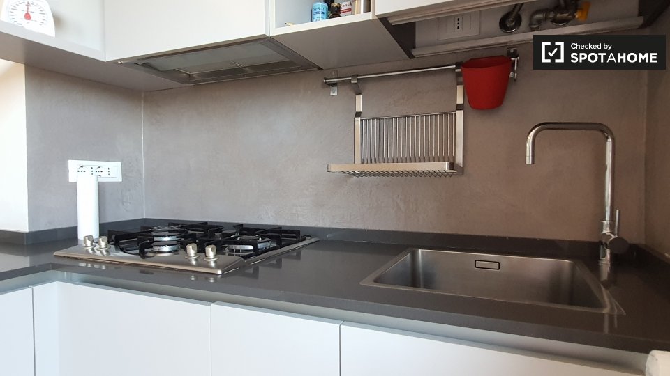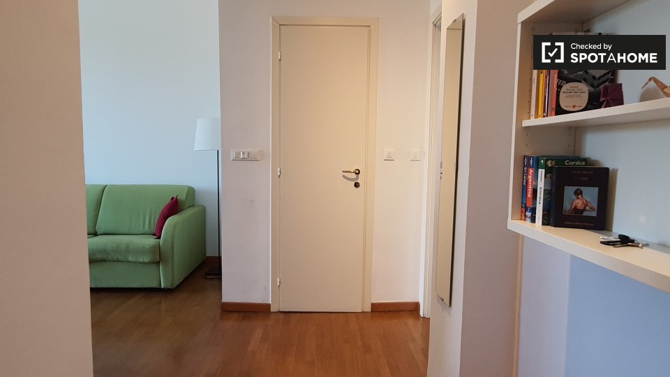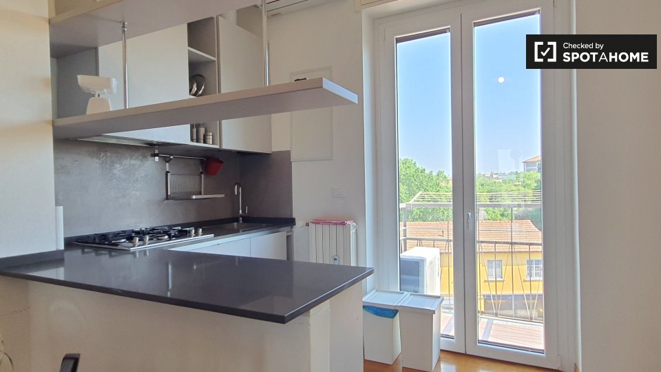 Questo appartamento arredato con una camera da letto a Villapizzone, Milano, dispone di una cucina ben attrezzata con forno e lavatrice in comune. È inoltre dotato di aria condizionata autonoma e balcone. Gli animali domestici sono ammessi con alc...