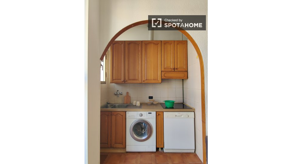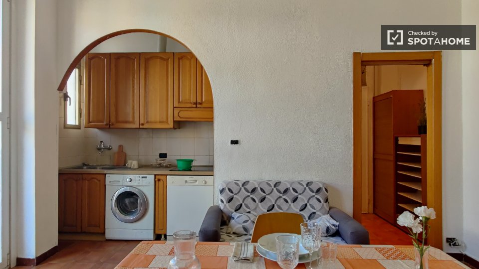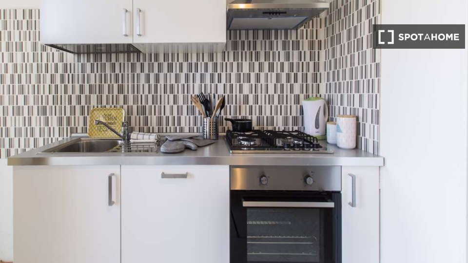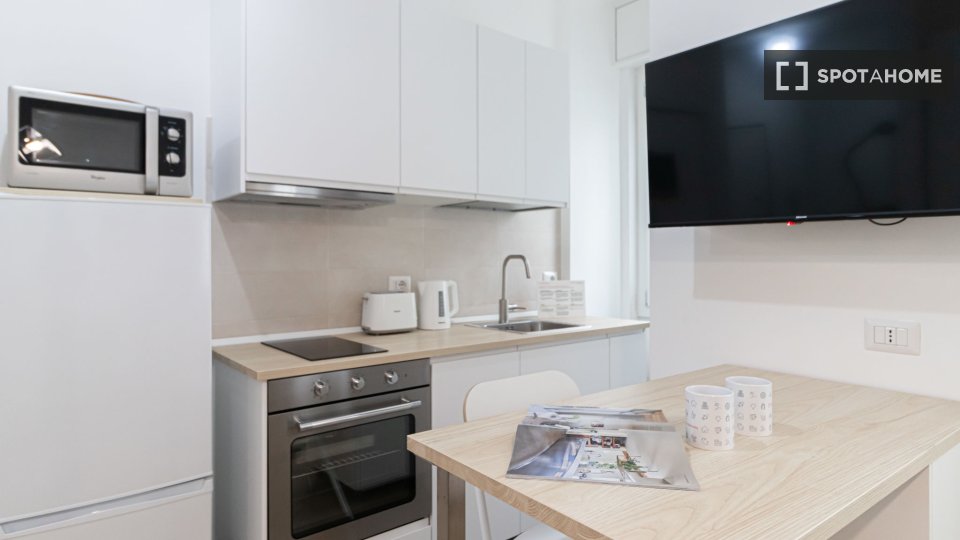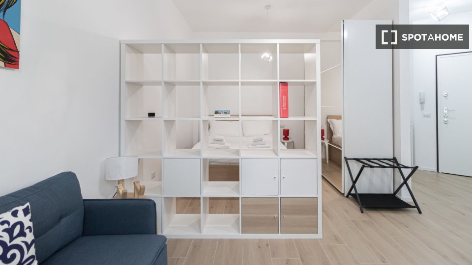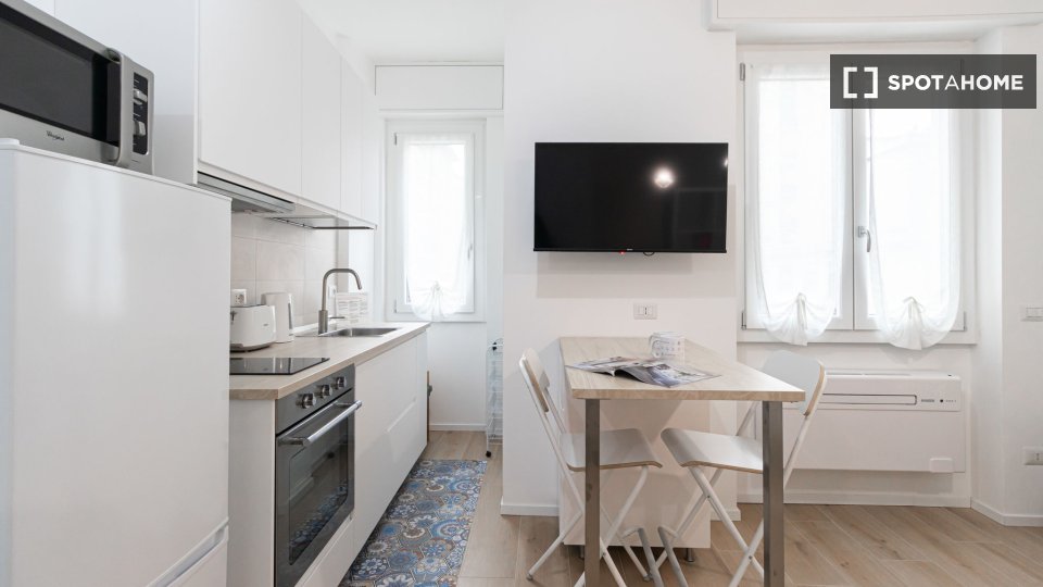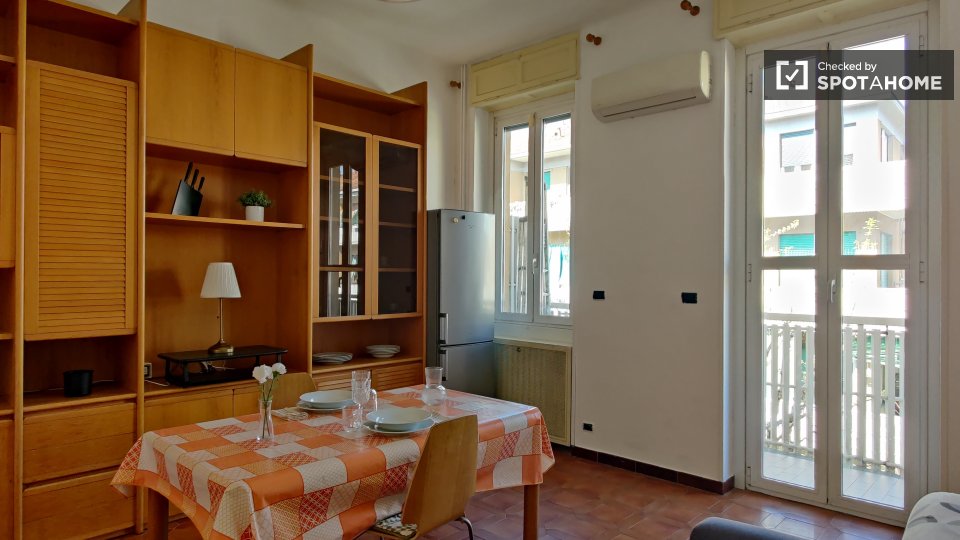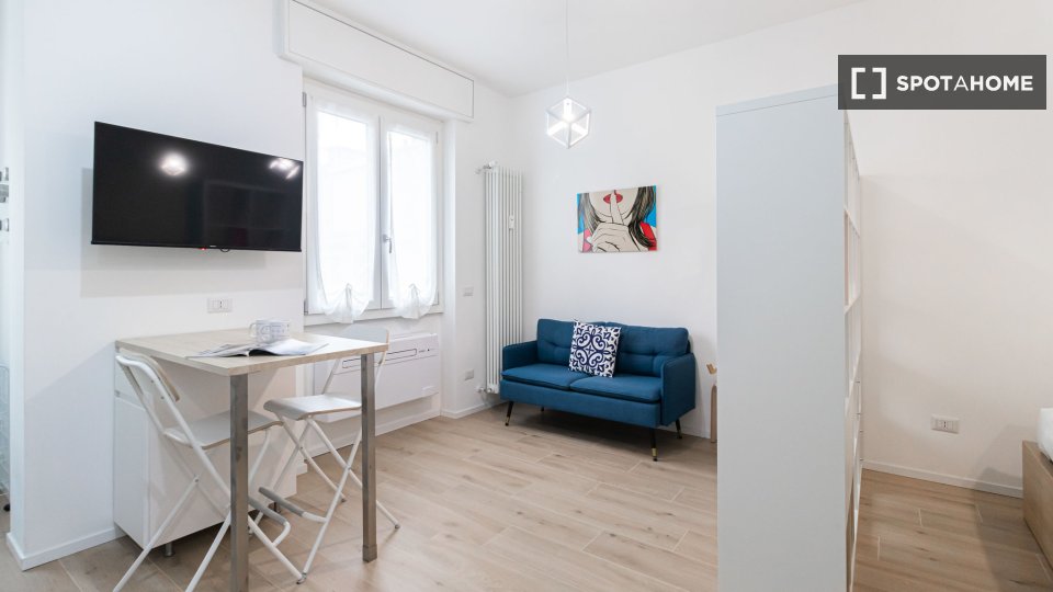 Questo accogliente monolocale arredato è disponibile per l'affitto a Giambellino, Milano. Il monolocale si affaccia sull'esterno e offre comfort come TV, aria condizionata centralizzata e cucina completamente attrezzata con lavastoviglie e forno. ...
