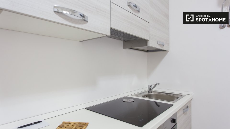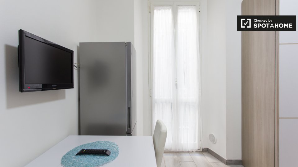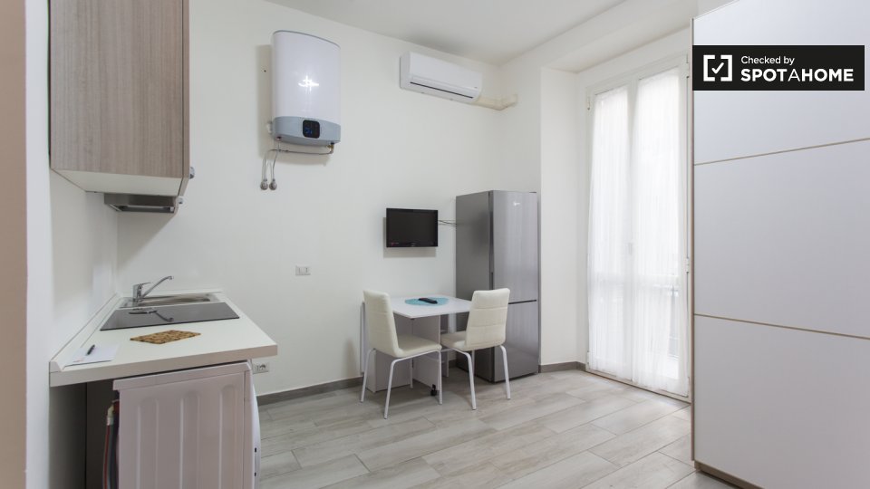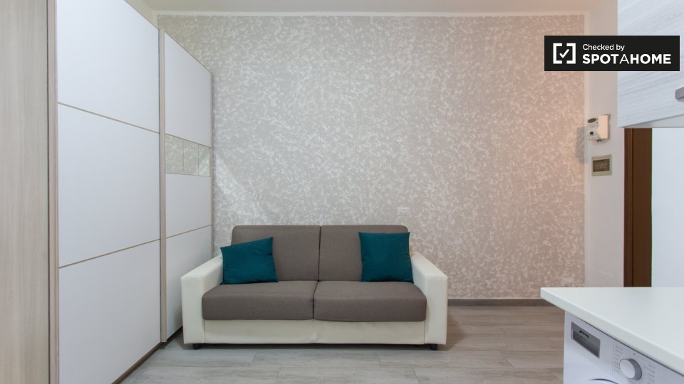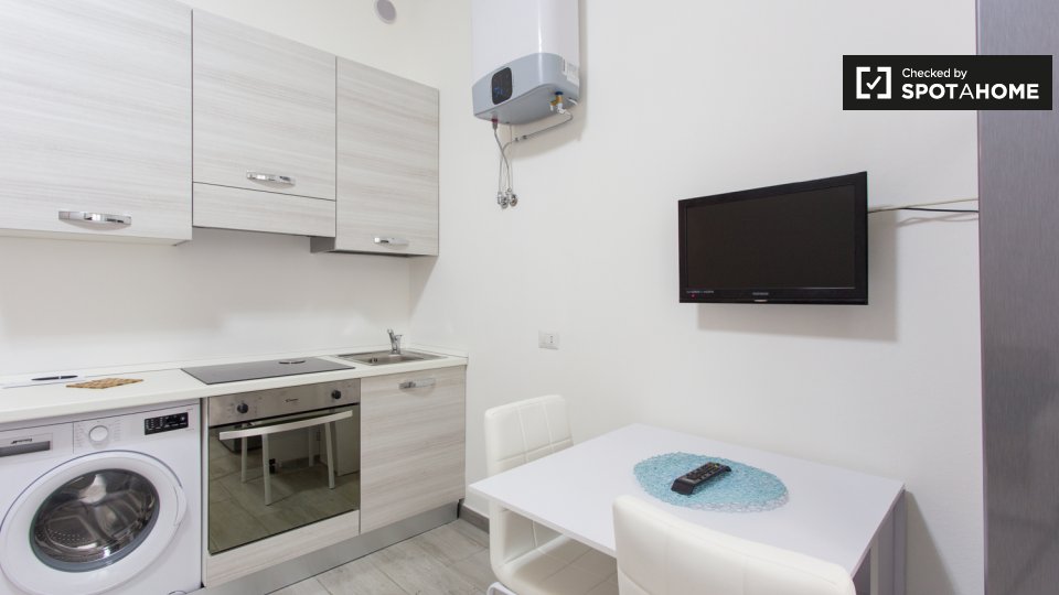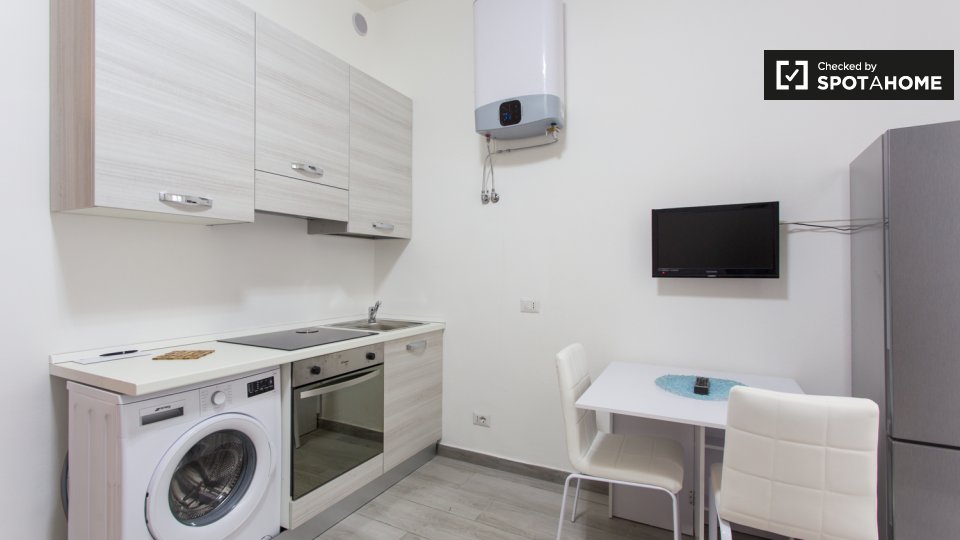 Questo monolocale in Porta Ticinese, a Milano, è un'ottima scelta per studenti o coppie. L'appartamento è completamente arredato e offre servizi essenziali, tra cui lavatrice, lavastoviglie, forno e TV. La cucina è completamente attrezzata, garant...