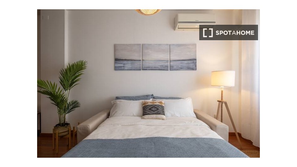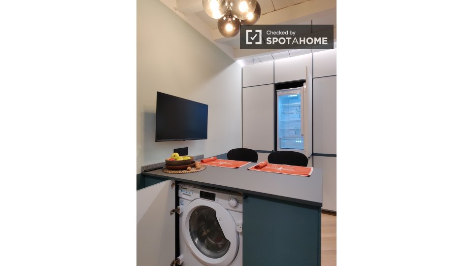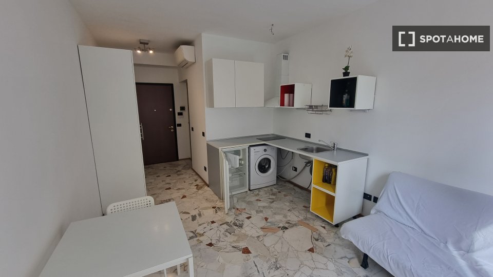 Questo monolocale a Guastalla, Milano, offre uno spazio abitativo confortevole e moderno. Completamente arredato e dotato di aria condizionata individuale, lavatrice e asciugatrice private, lavastoviglie e TV, questo residence è ideale per profess...