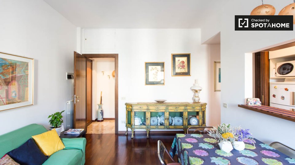 Scopri un confortevole spazio abitativo condiviso in un appartamento con 2 camere da letto situato a Trieste, Roma. Questa proprietà è riservata esclusivamente a donne e può ospitare sia professioniste che studentesse. L'appartamento è completamen...