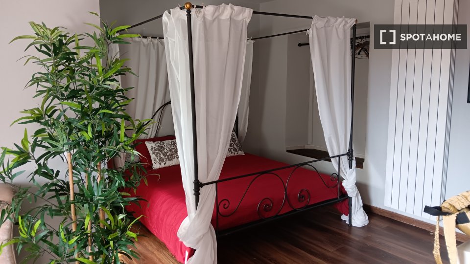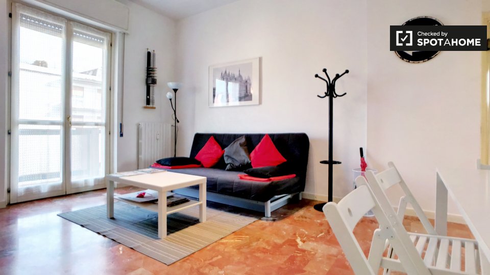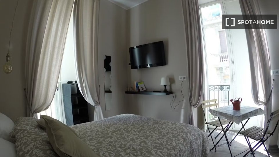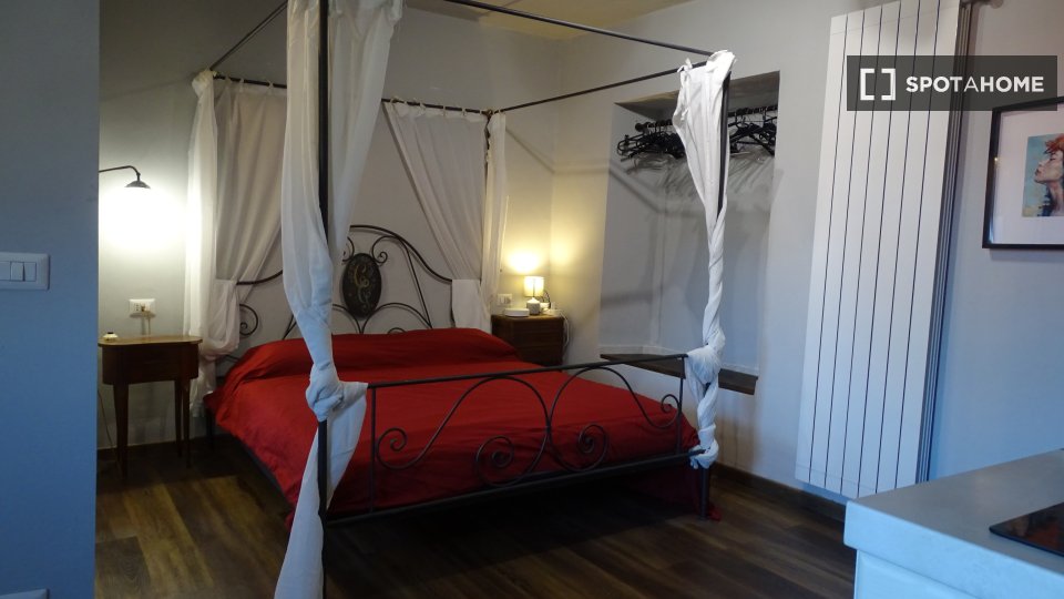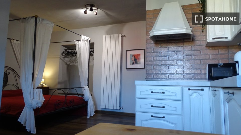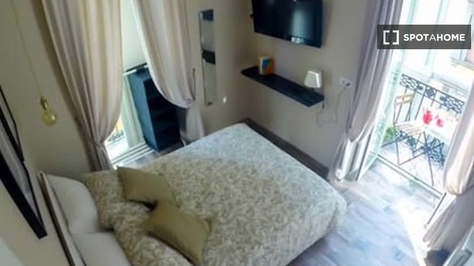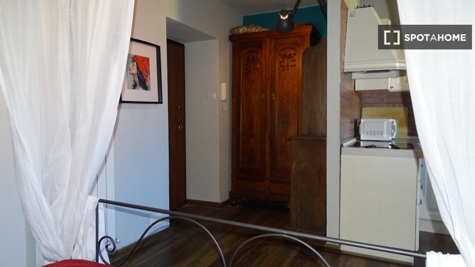 Monolocale con letto matrimoniale e balcone privato. Zona lavanderia nel corridoio fuori dalla stanza. Adatto per una persona, una coppia o due amici.