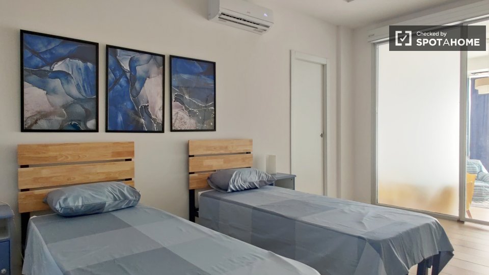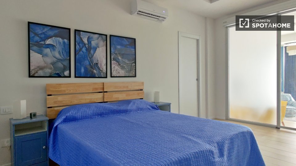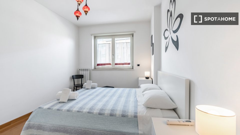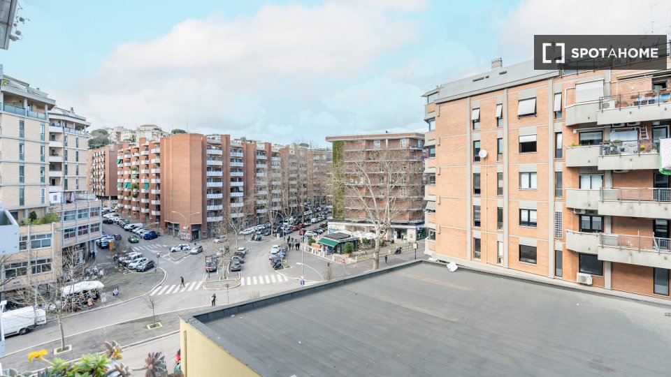 Scoprite il comfort e la praticità di questa camera completamente arredata e dotata di aria condizionata centralizzata, in un appartamento condiviso con 4 camere da letto a Monte Sacro Alto, Roma. Questa camera dispone di un balcone privato, una c...