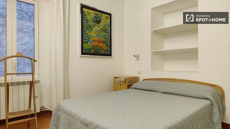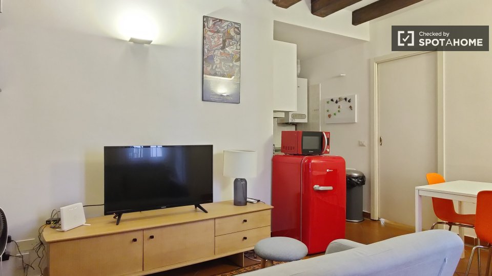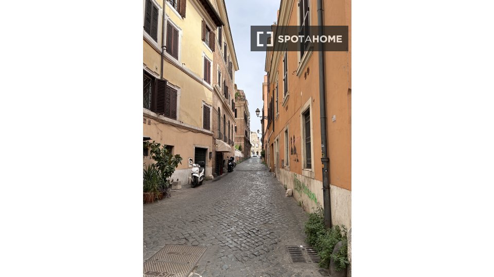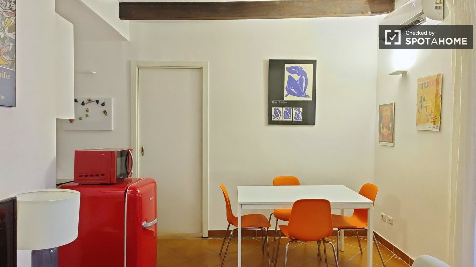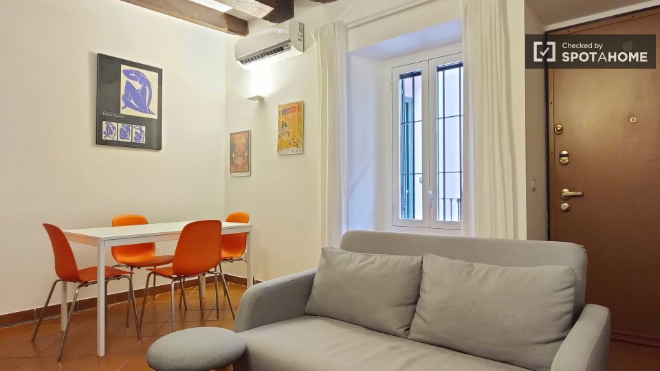 Cerchi un accogliente appartamento a Trastevere? Questo appartamento completamente arredato con una camera da letto offre servizi pratici come il riscaldamento a gas metano e l'aria condizionata individuale. La cucina attrezzata include elettrodom...