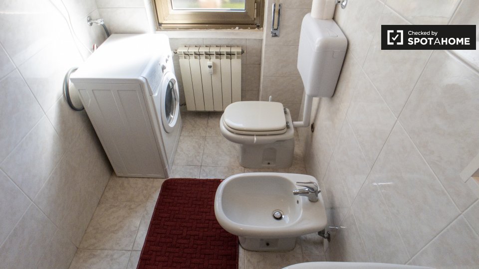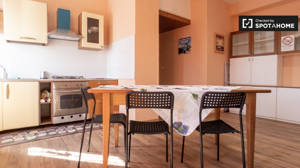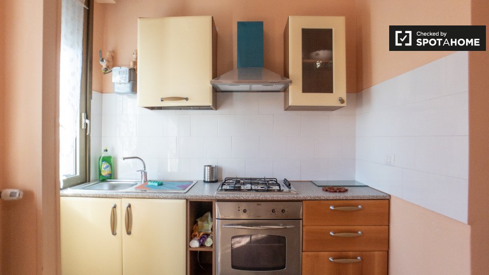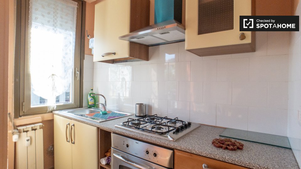 Questa camera arredata in un appartamento condiviso con 3 camere da letto a Villapizzone è dotata di aria condizionata individuale, riscaldamento centralizzato, balcone e cucina completamente attrezzata con elettrodomestici moderni, tra cui forno ...