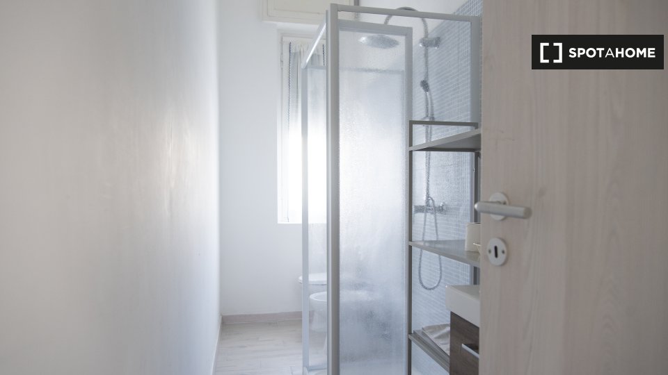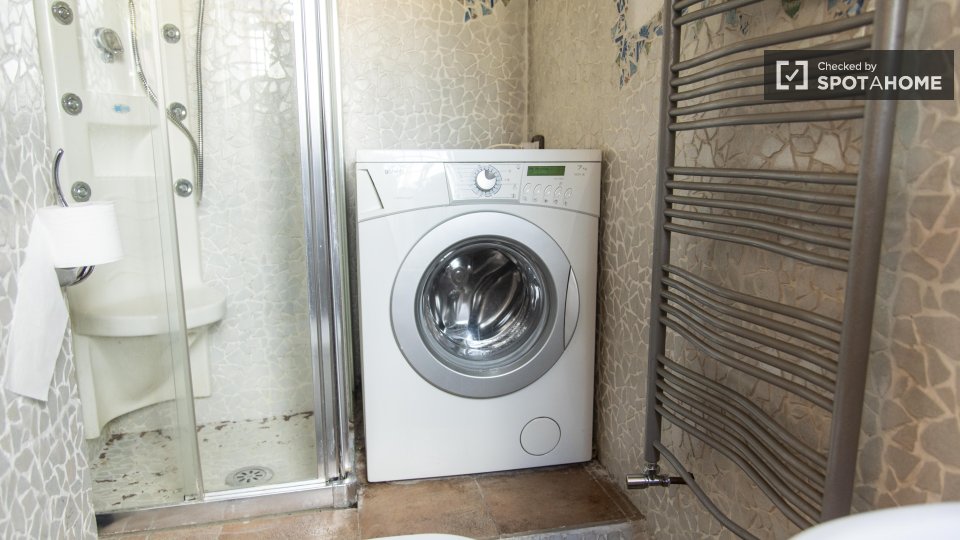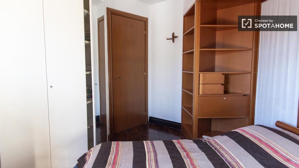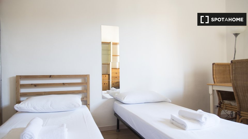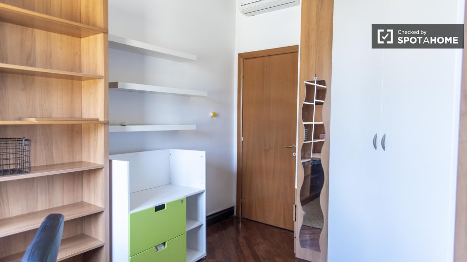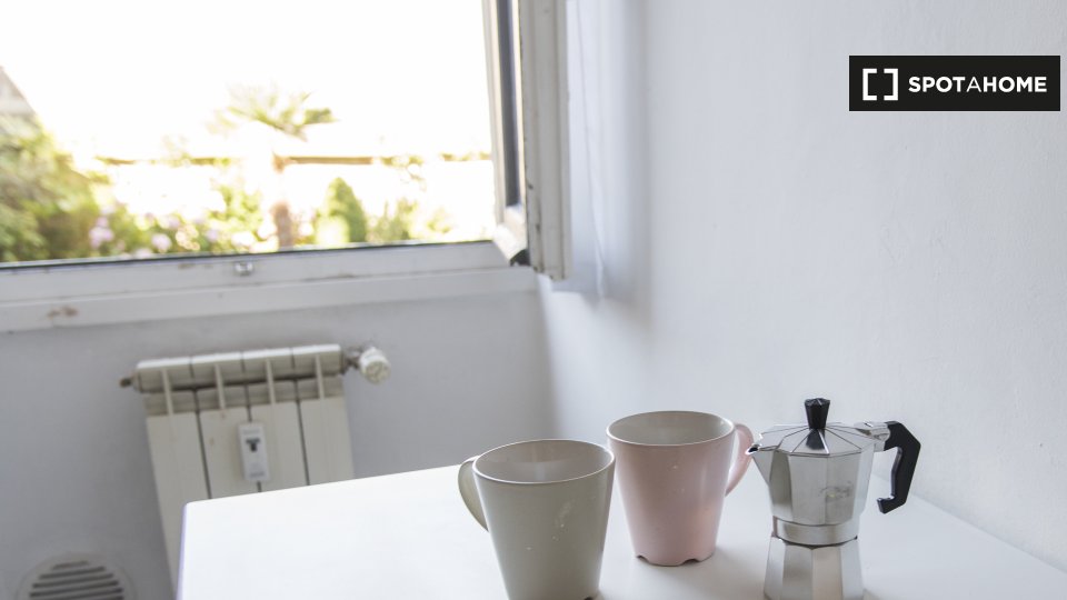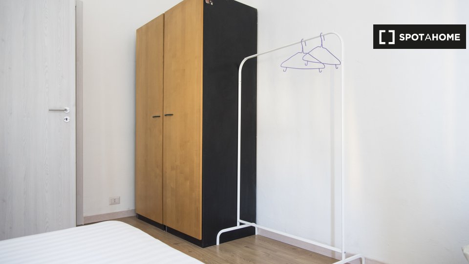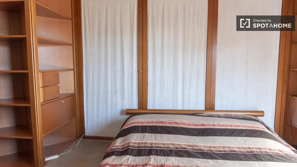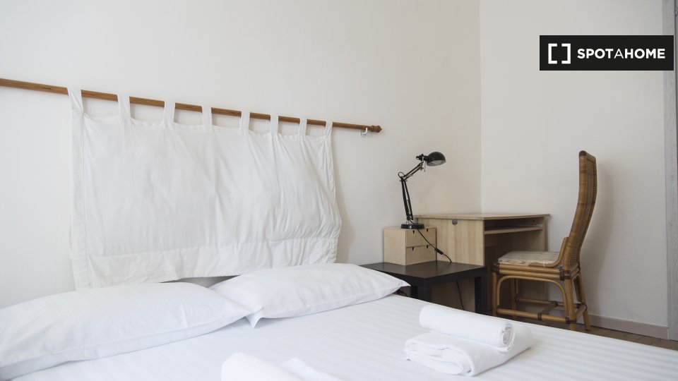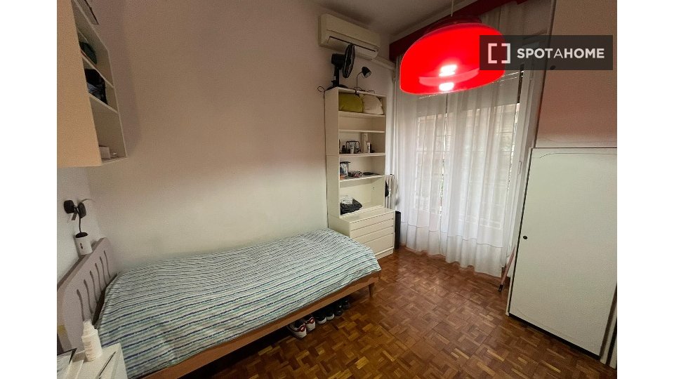 Questa camera in un appartamento condiviso con 3 camere da letto offre un'esperienza abitativa confortevole e ben arredata. L'appartamento è dotato di aria condizionata individuale e di un balcone per una maggiore comodità. La cucina attrezzata è ...