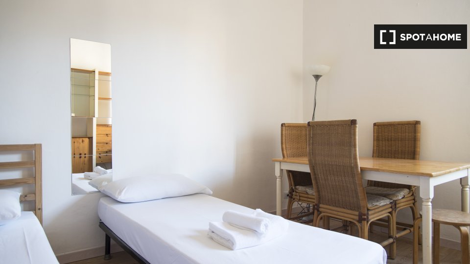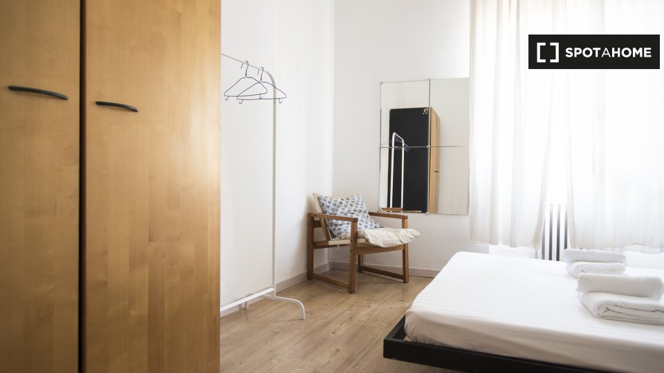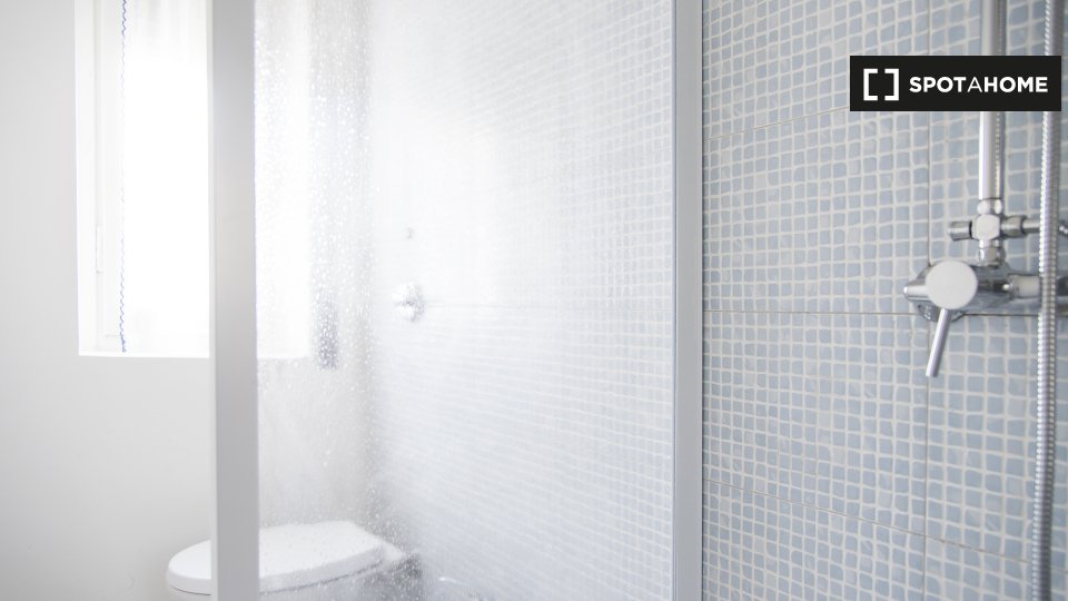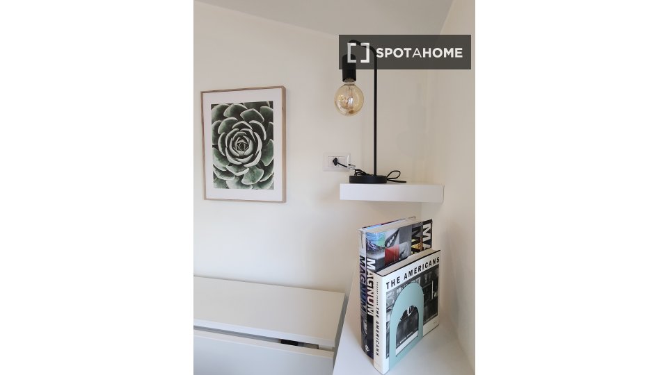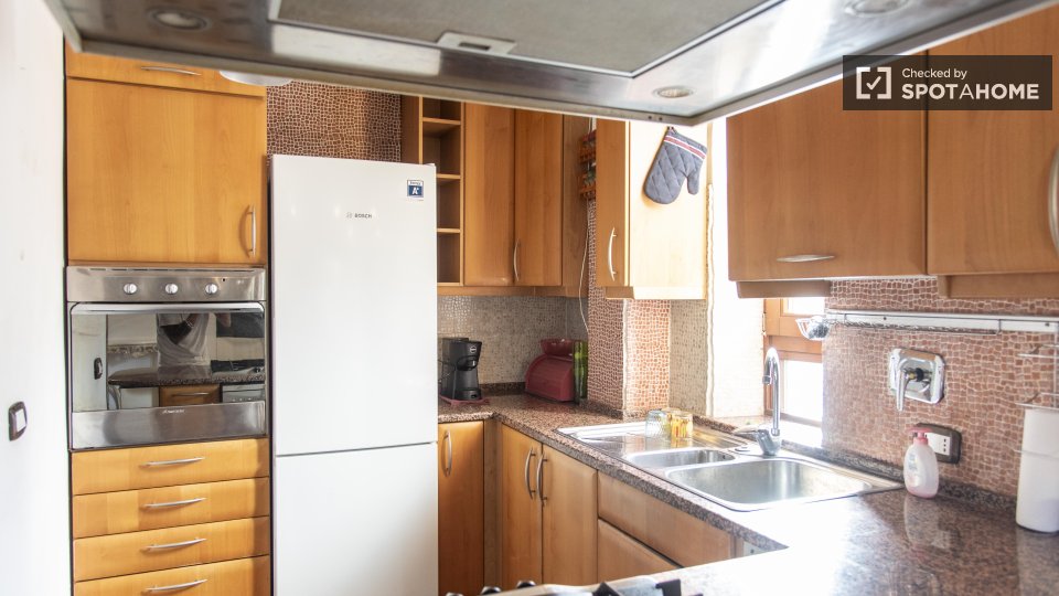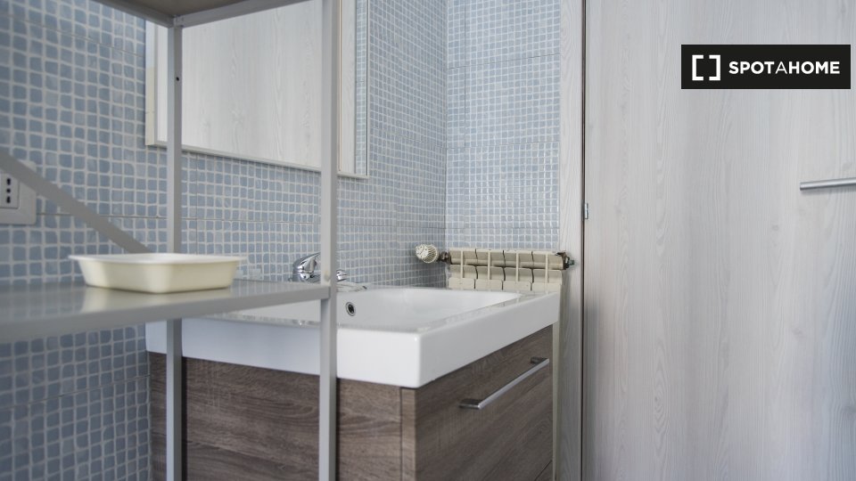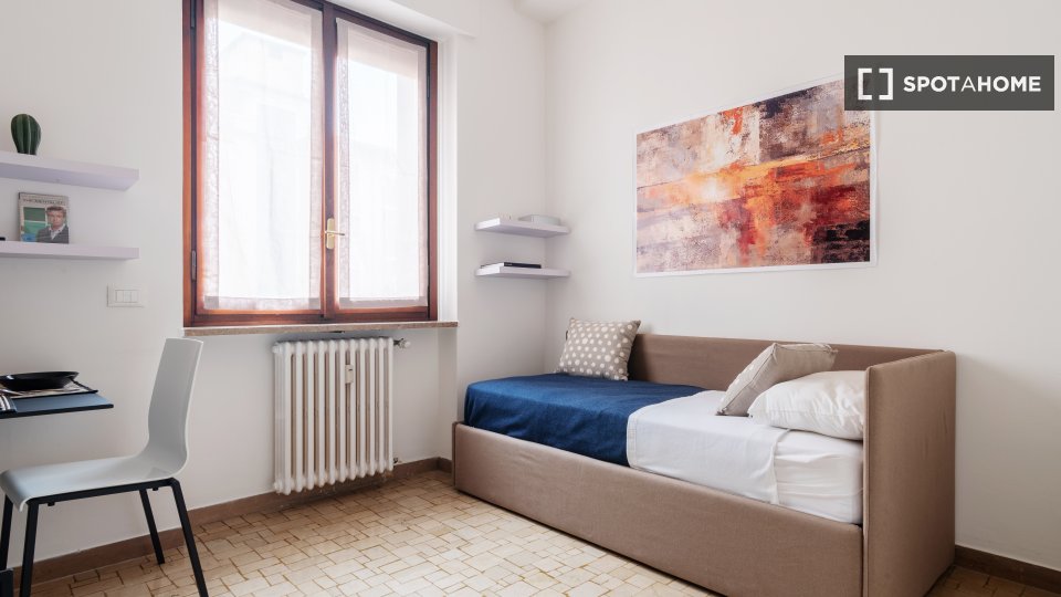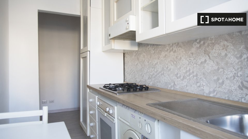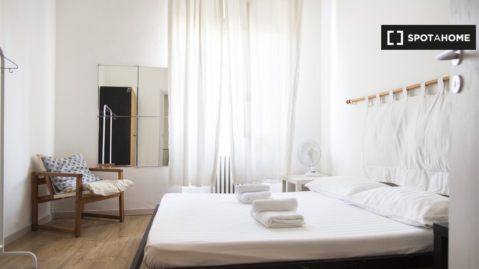 Questa camera in un appartamento condiviso con 3 camere da letto offre un'esperienza abitativa confortevole e ben arredata. L'appartamento è dotato di aria condizionata individuale e di un balcone per una maggiore comodità. La cucina attrezzata è ...