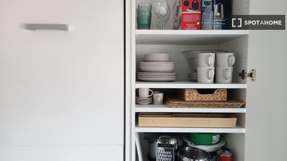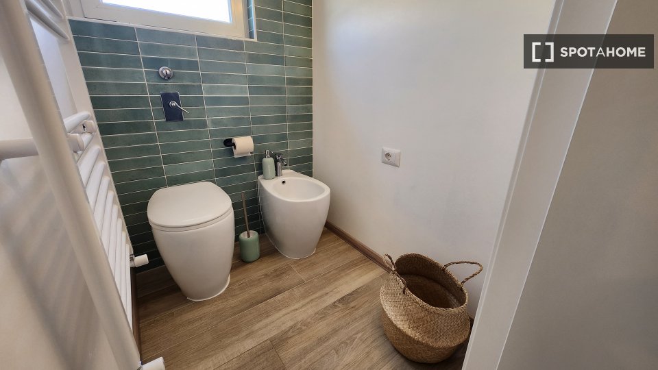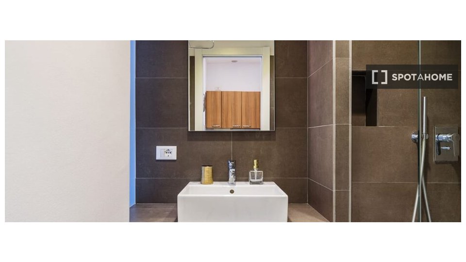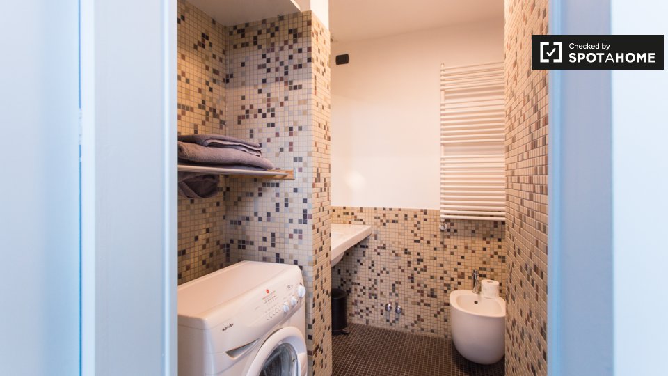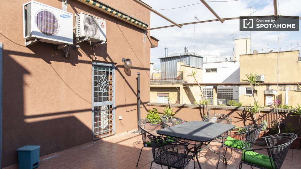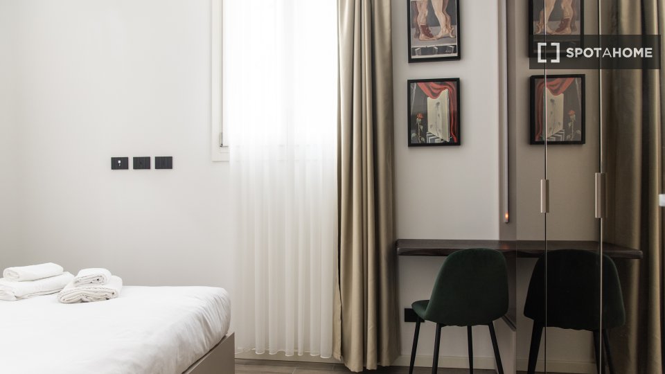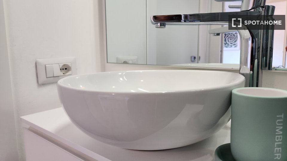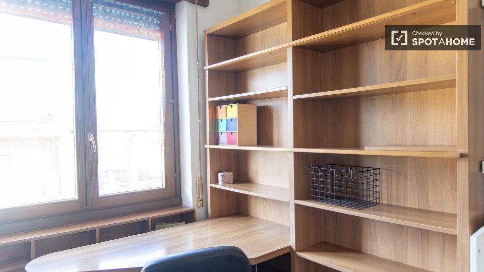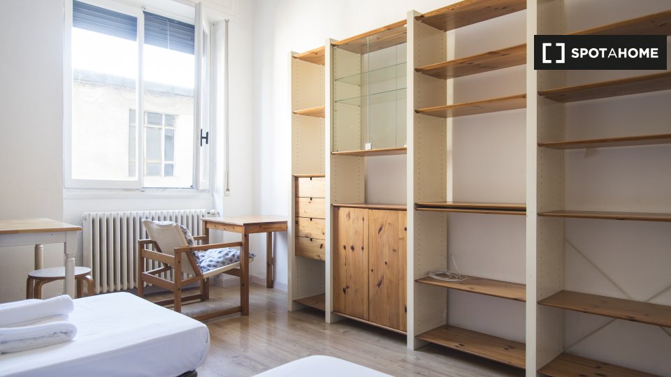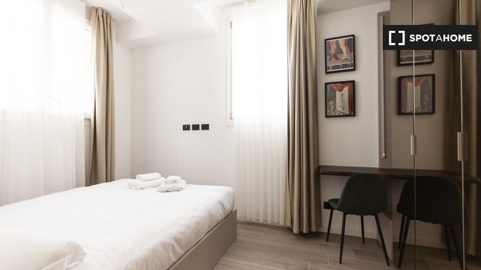 Questa camera in un appartamento condiviso con 3 camere da letto offre un'esperienza abitativa confortevole e ben arredata. L'appartamento è dotato di aria condizionata individuale e di un balcone per una maggiore comodità. La cucina attrezzata è ...