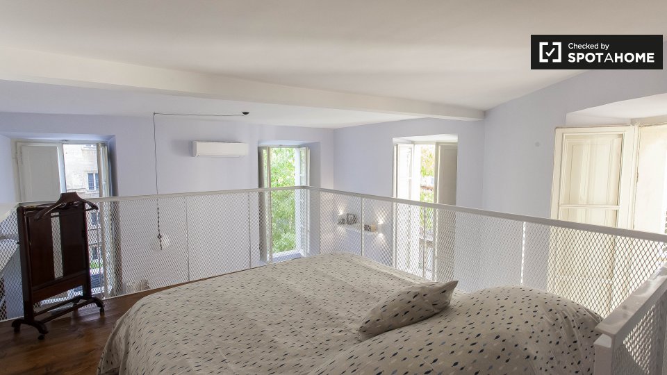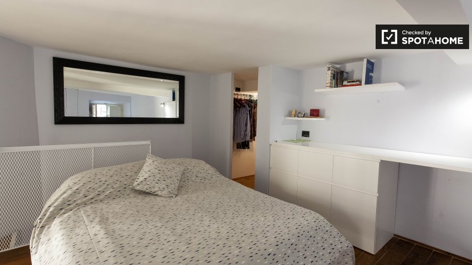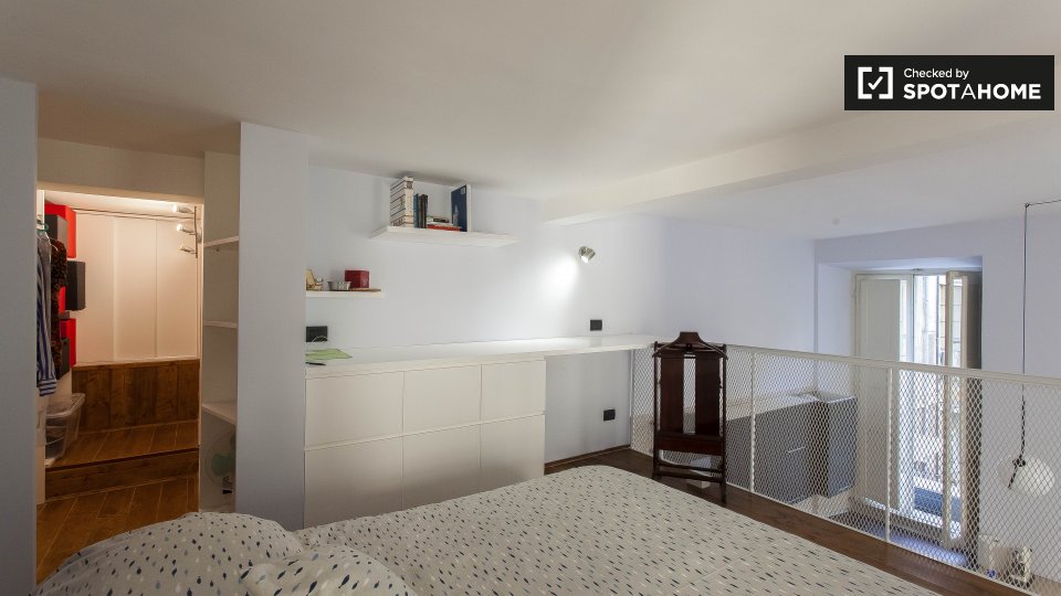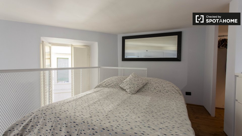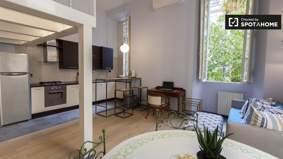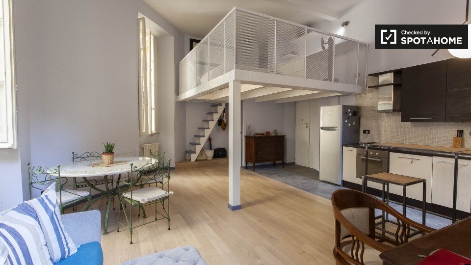 Un moderno loft con aria condizionata è disponibile in affitto vicino alla metropolitana di Prati. L'appartamento ha un'elegante sala principale, dove troverete un comodo divano (che è un divano letto matrimoniale), una TV e un'enorme camera da le...