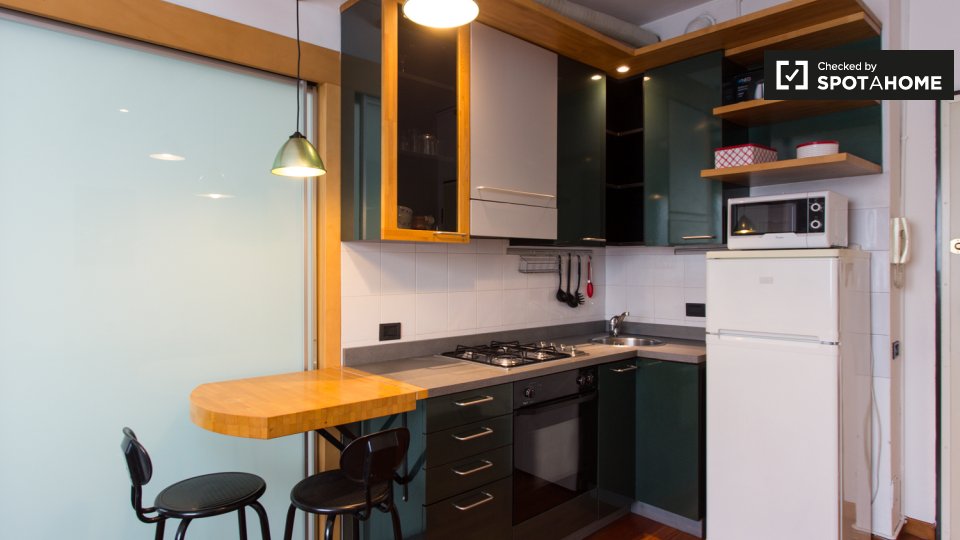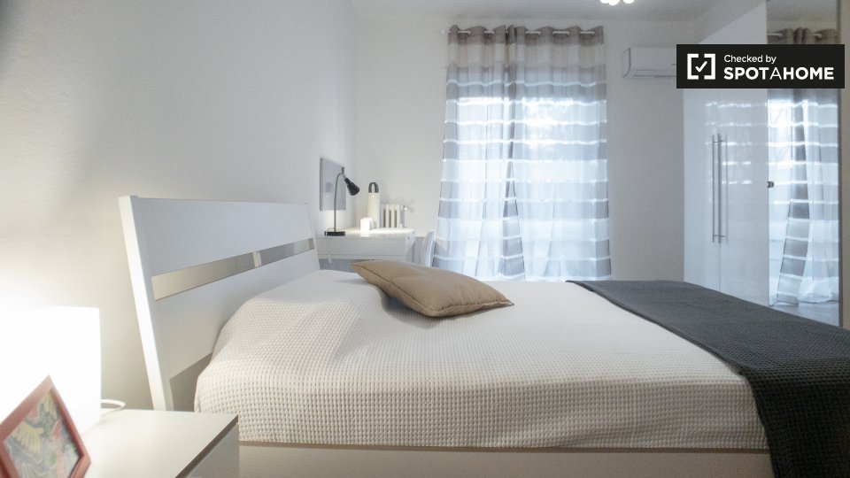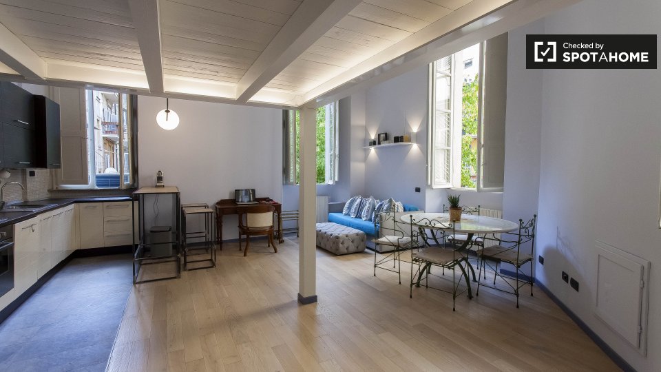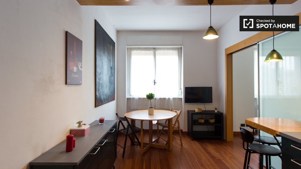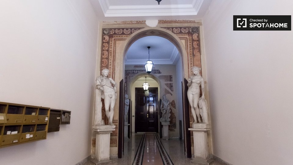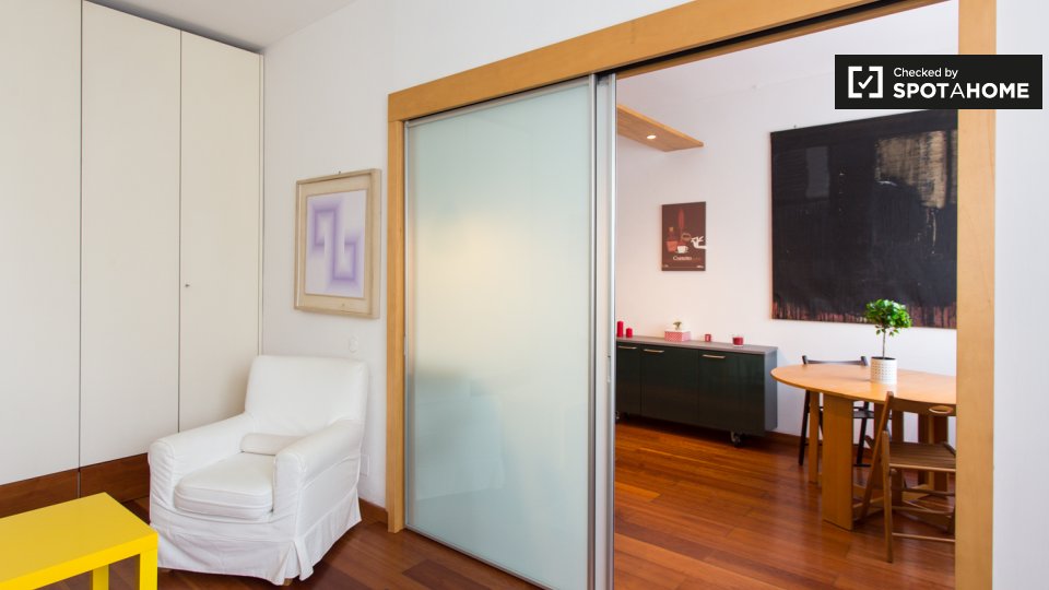 Un moderno loft con aria condizionata è disponibile in affitto vicino alla metropolitana di Prati. L'appartamento ha un'elegante sala principale, dove troverete un comodo divano (che è un divano letto matrimoniale), una TV e un'enorme camera da le...