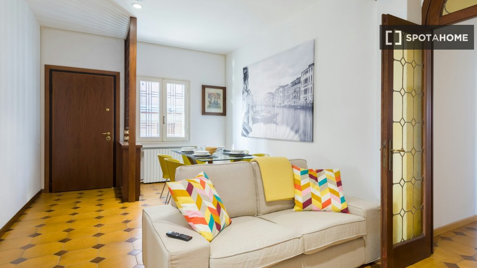 Questo appartamento splendidamente arredato nel Quartiere della Vittoria, a Roma, è perfetto per professionisti, studenti o coppie. L'appartamento è dotato di aria condizionata individuale e di un ascensore per un facile accesso. È completamente a...