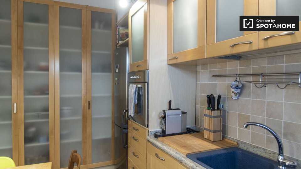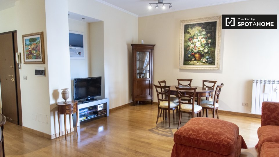 Scopri questo grazioso appartamento con una camera da letto in affitto ad Aurelio Sud, Roma. Questo appartamento completamente arredato dispone di una cucina accogliente e attrezzata, lavatrice privata e comfort come lavastoviglie, forno e TV, gar...