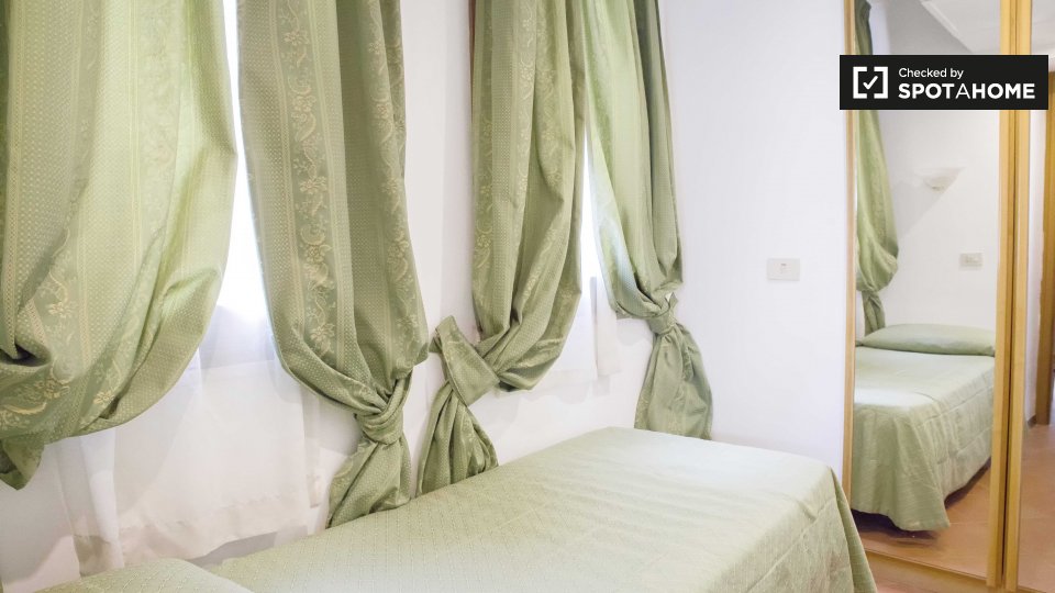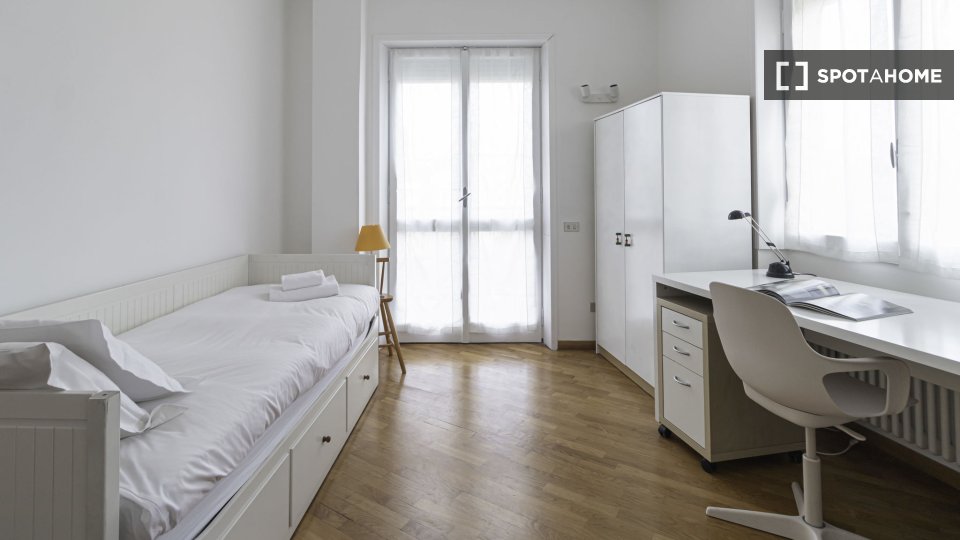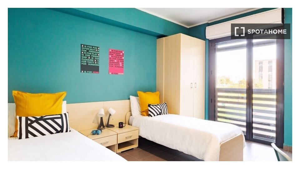 Appartamento con una camera da letto con due letti singoli, cucina, bagno. **1.540 posti letto**, suddivisi in 17 unità su un'area di **50.000 mq** con **15.000 mq di aree verdi**. Questo campus è **il più grande alloggio per studenti in Itali...