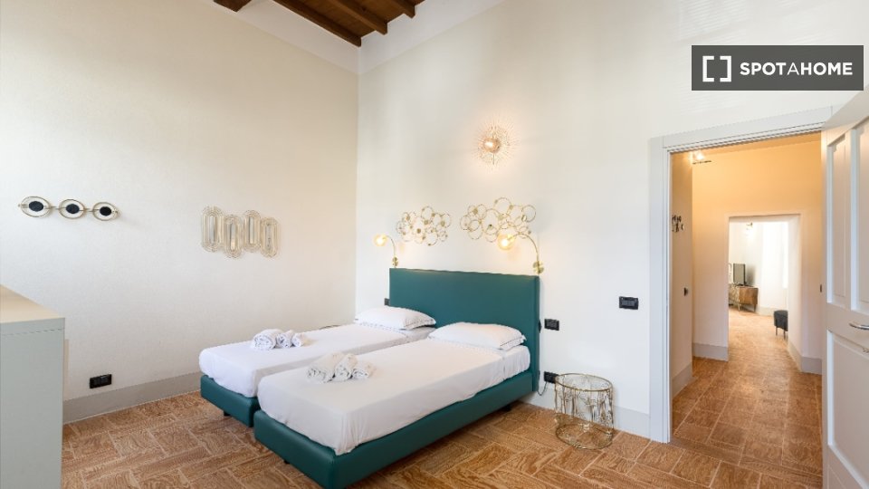 Appartamento con tre camere da letto. Questo ampio quadrilocale è composto da un soggiorno con divano e una cucina a vista. la zona notte dispone di tre camere da letto con letto matrimoniale ciascuna. Infine sono presenti due bagni con doccia.