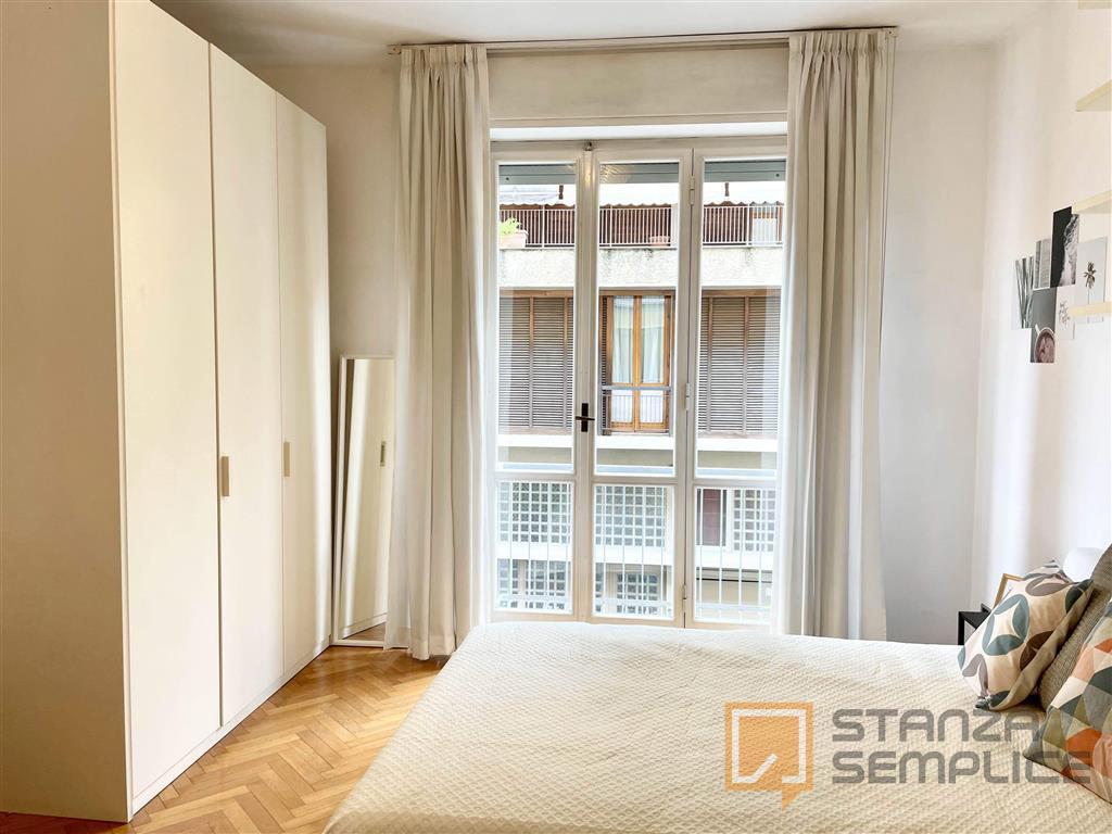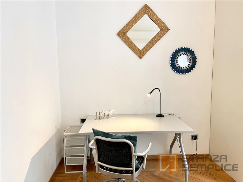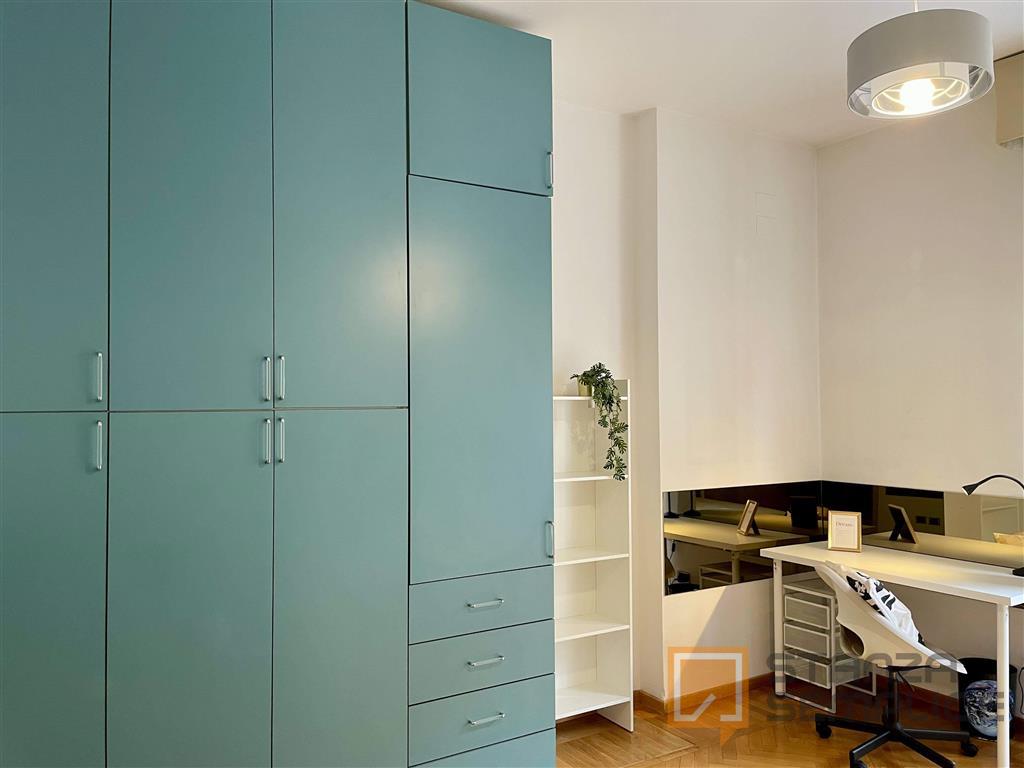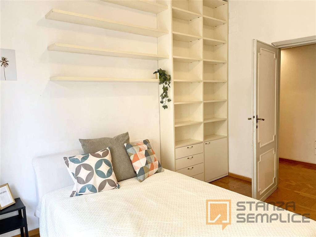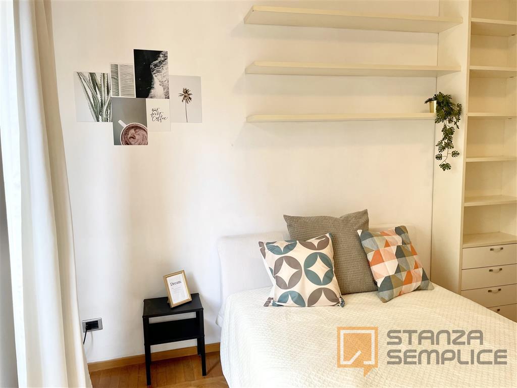 Stanza singola luminosa e completamente arredata, ideale per studenti che cercano tranquillità e comfort. La camera è dotata di letto da una piazza e mezzo, armadio a 3 ante, cassettiera, libreria, scrivania con sedia, comodino e tendaggi. L’arre...