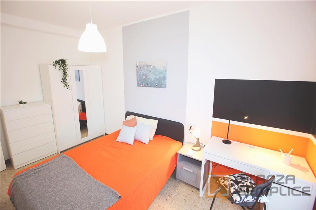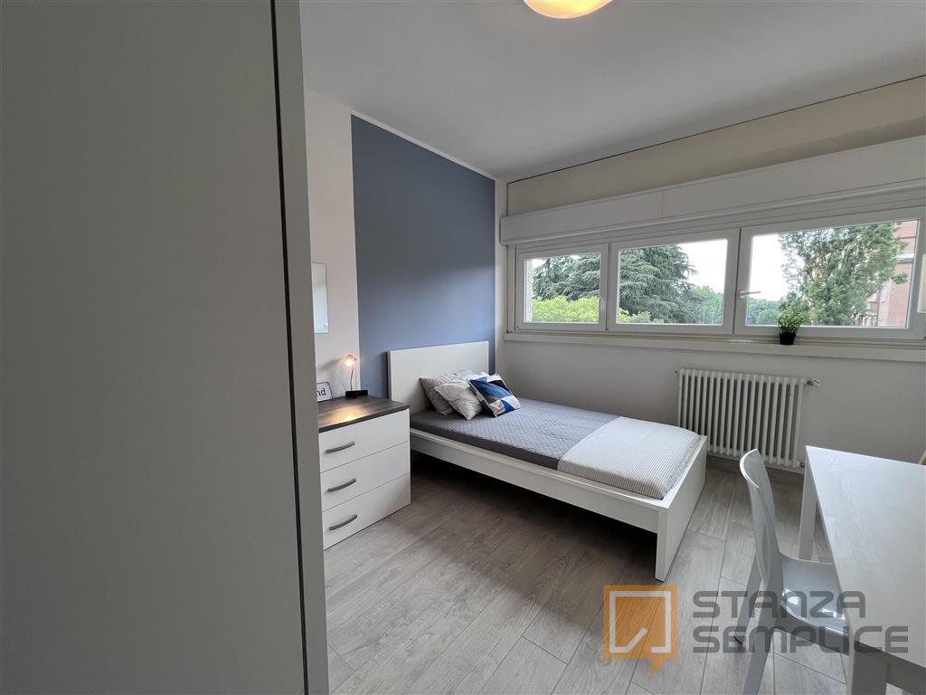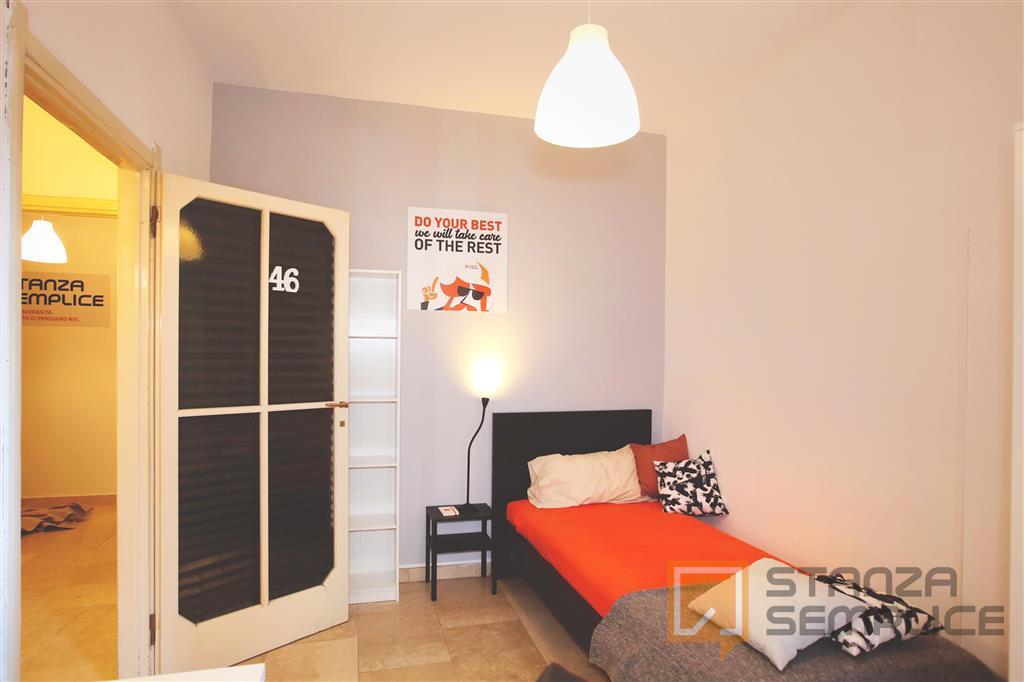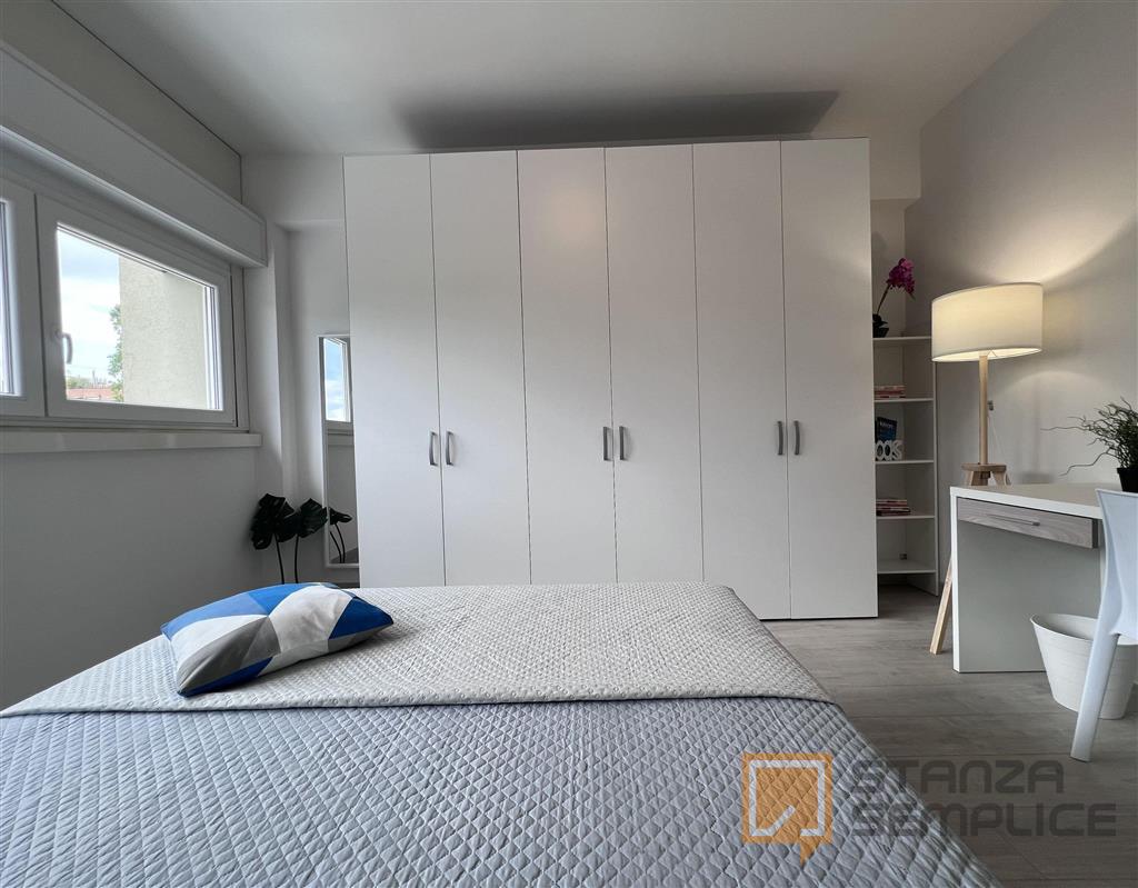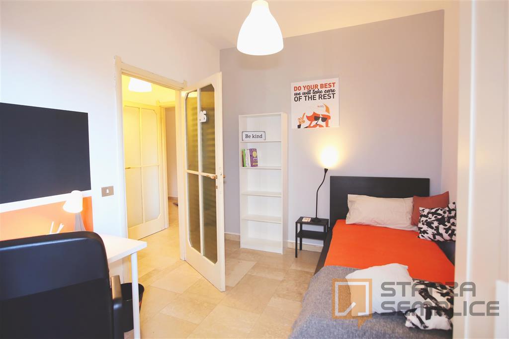 Stanza singola molto ampia, luminosa e completamente arredata, ideale per studenti che cercano comfort e tranquillità. È dotata di letto a una piazza e mezza, armadio a 3 ante, cassettiera, libreria, scrivania con portaoggetti, comodino, scarpiera...