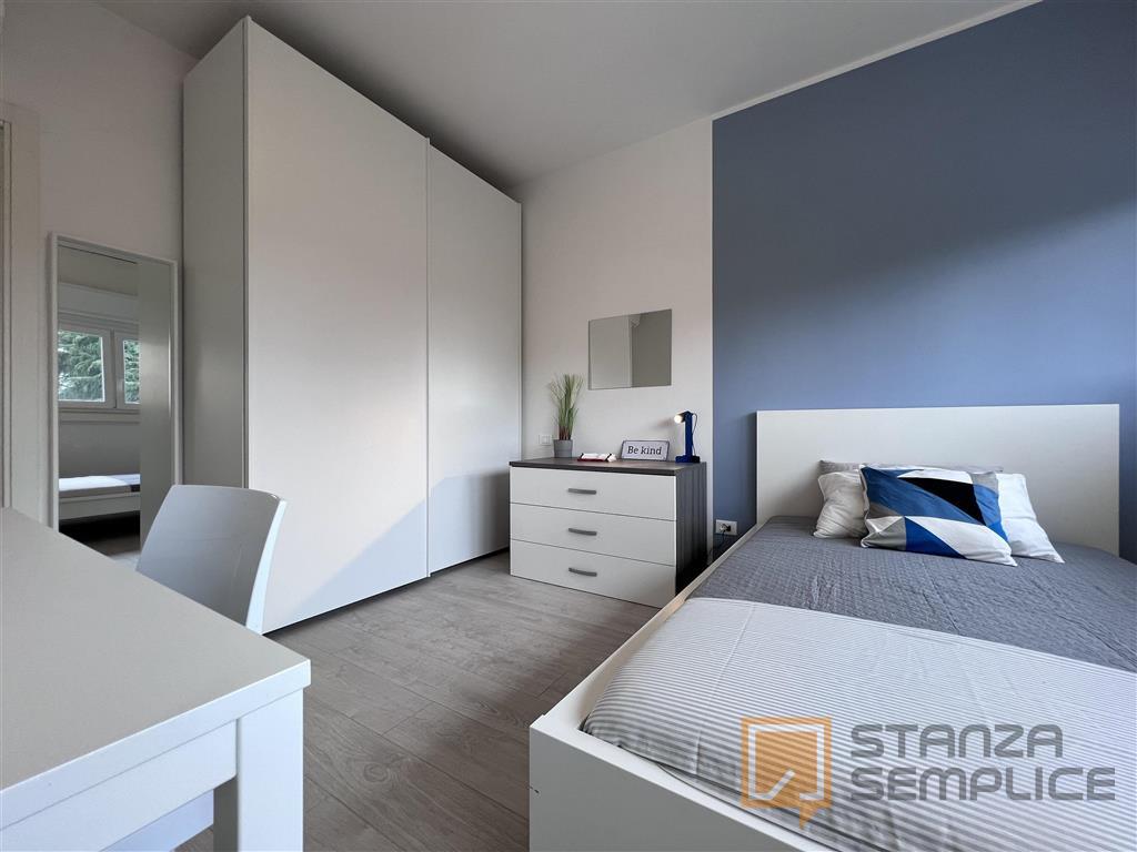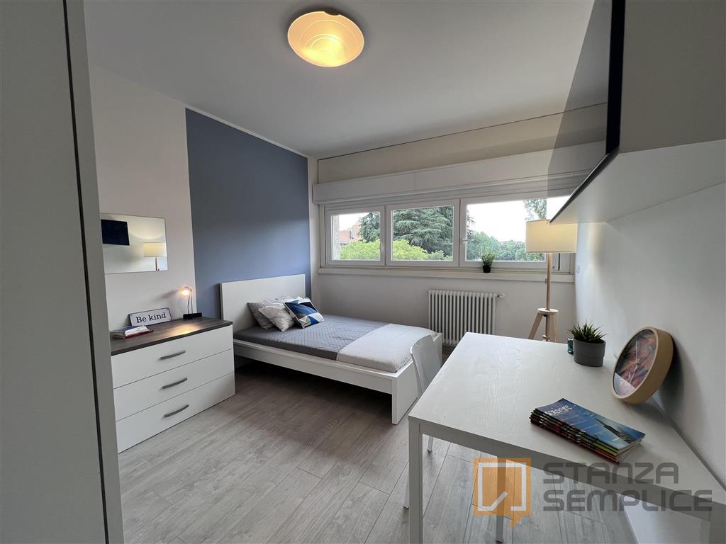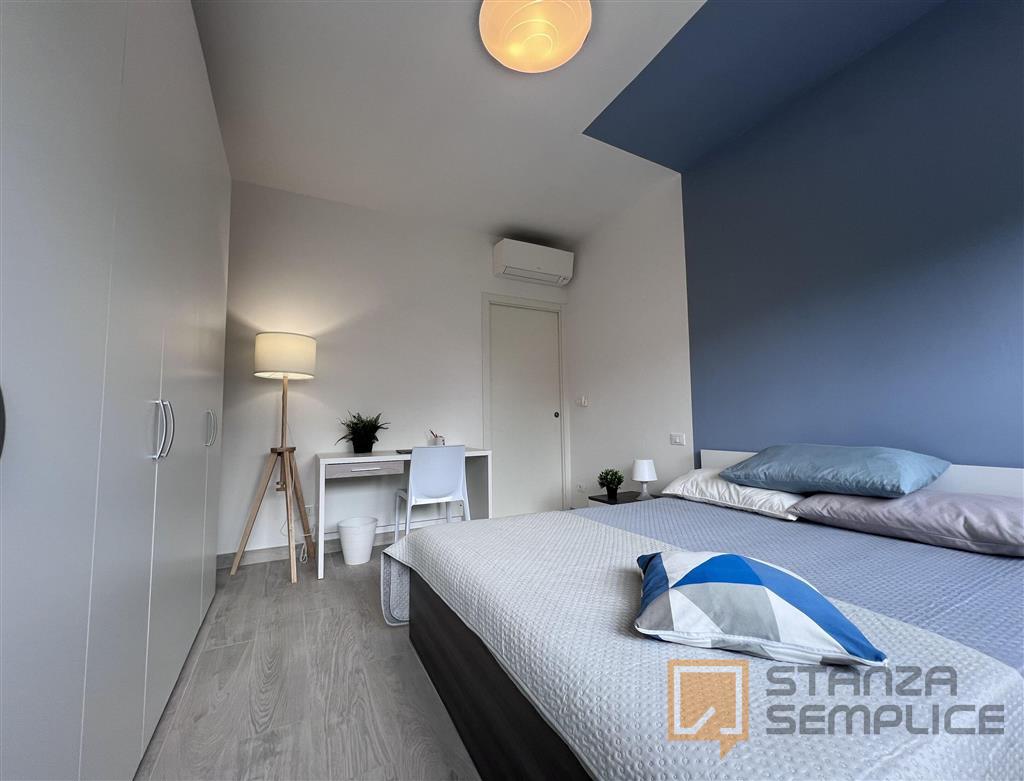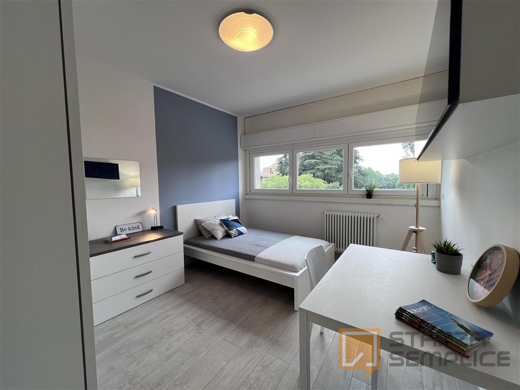 Stanza singola luminosa e completamente arredata, ideale per studenti che cercano comfort e tranquillità. È dotata di letto a una piazza e mezza, armadio a 3 ante, cassettiera, libreria, scrivania con portaoggetti, comodino, scarpiera e tendaggi. ...