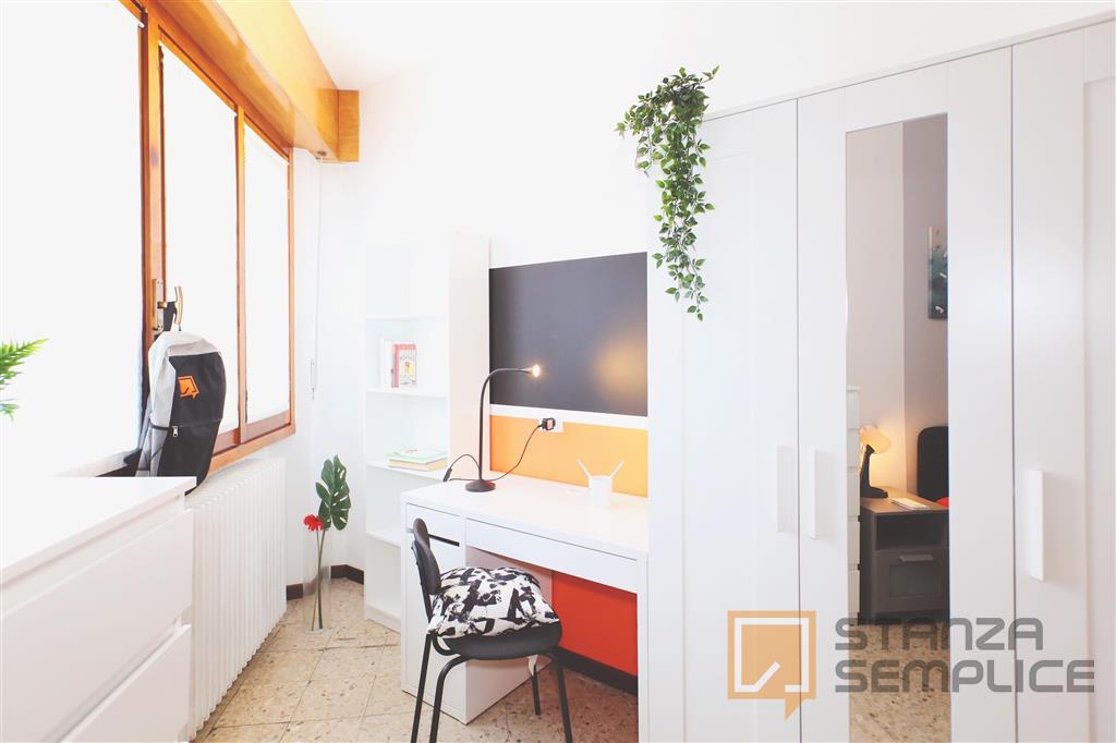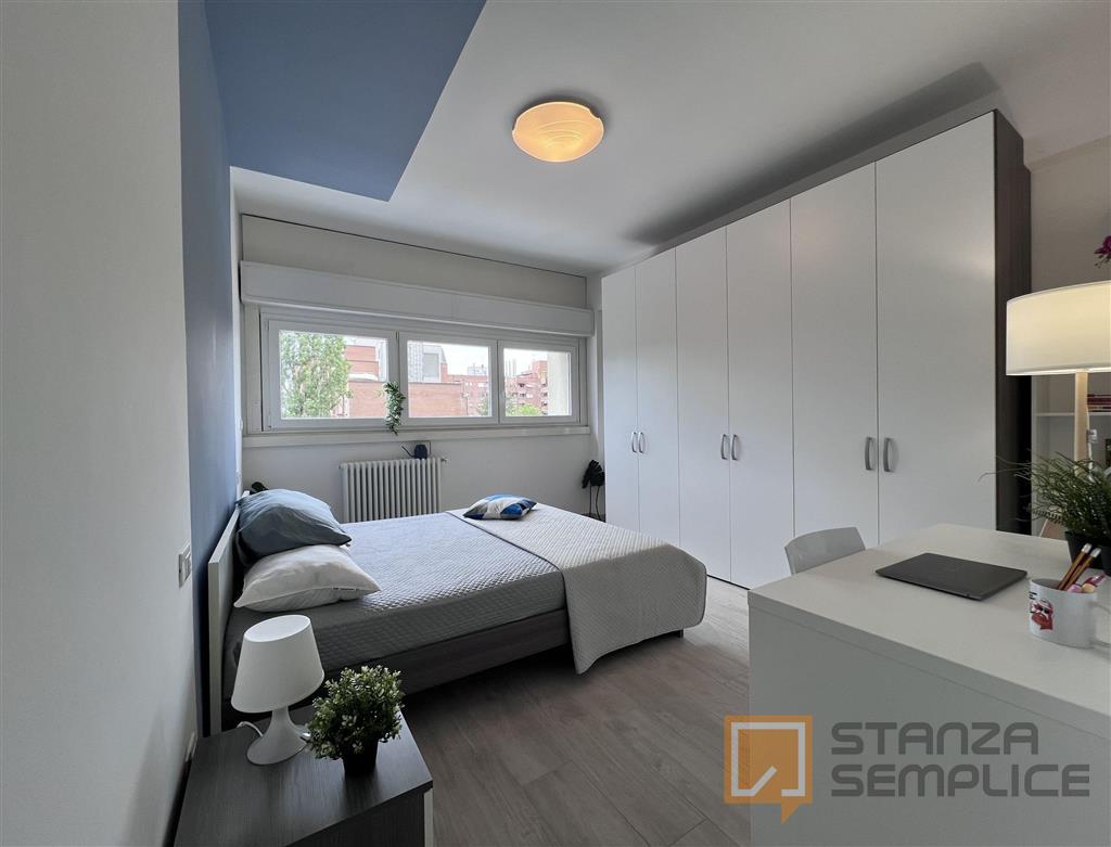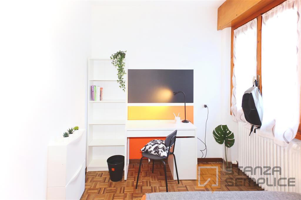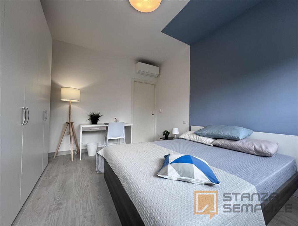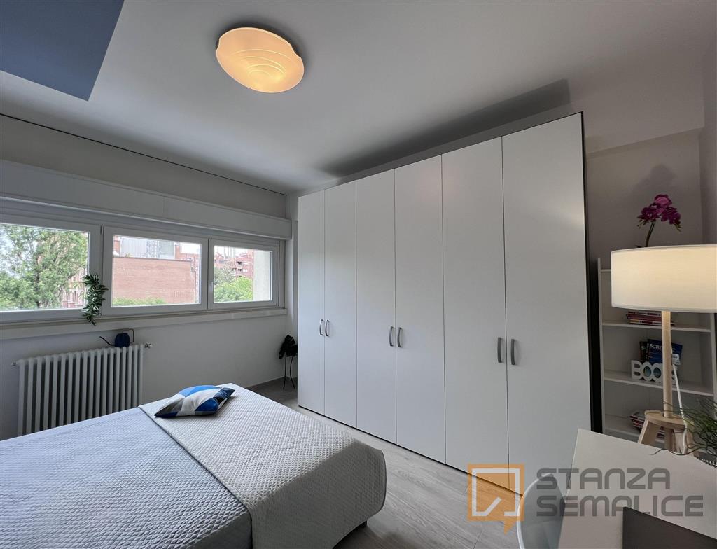 Stanza singola luminosa e completamente arredata, ideale per studenti che cercano comfort e tranquillità. È dotata di letto a una piazza e mezza, armadio a 3 ante, cassettiera, libreria, scrivania con portaoggetti, comodino, scarpiera e tendaggi. ...