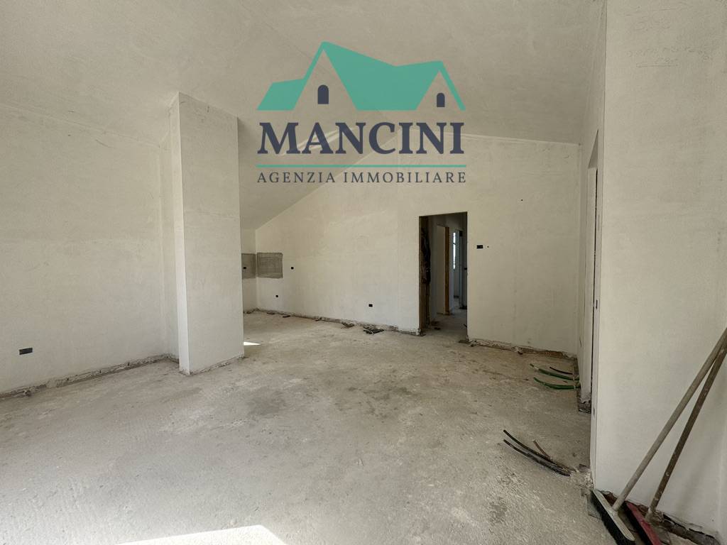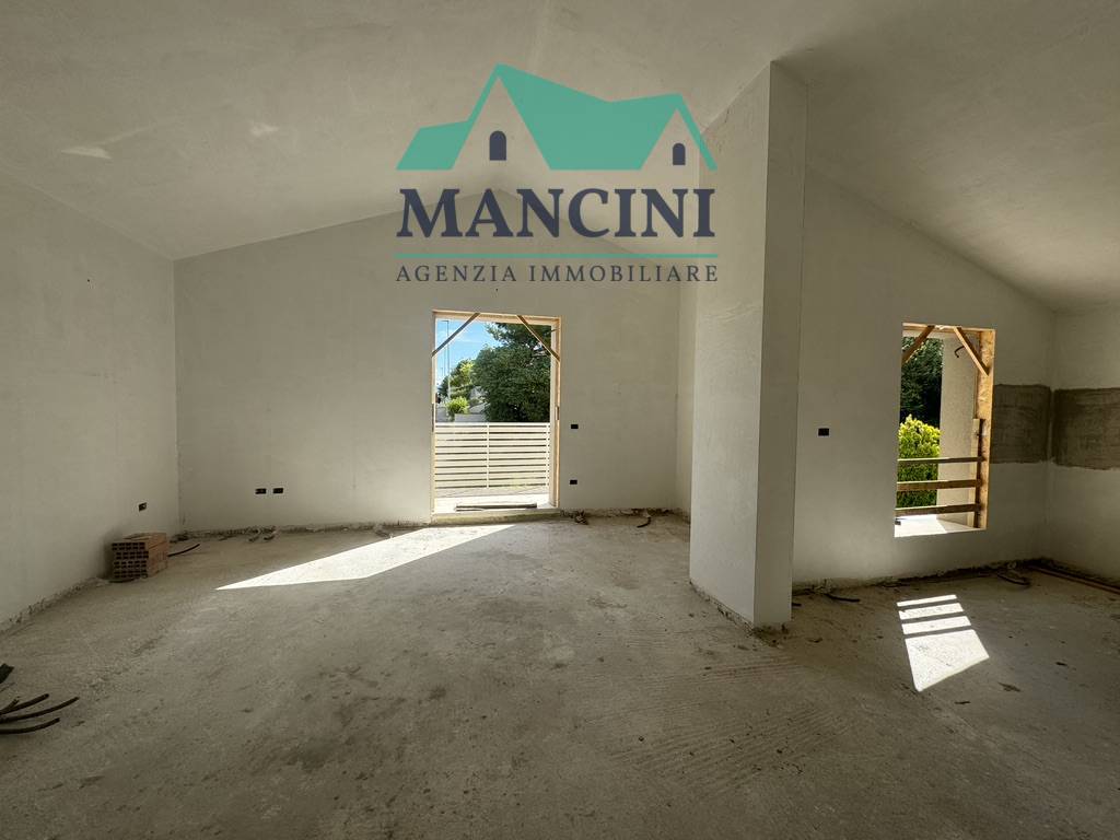 Bifamiliare nuova costruzione in Jesi mq 110 con giardino mq 350 garage calsse A/4, corte, taverna, così composta, piano terra, si entra nella zona giorno con angolo cottura per un totale di mq 36,90 nella zona notte troviamo tre camere di cui una...