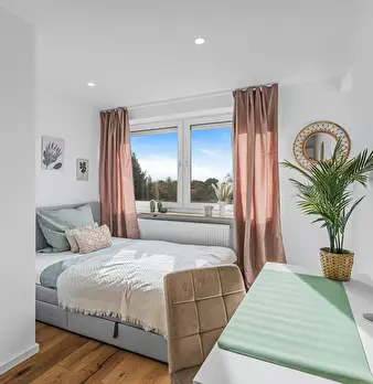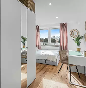 Room Description This well-appointed private room on Römerhofweg in Garching near Munich offers a comfortable living space of 12m2. The room is furnished with a cozy bed, a spacious wardrobe, and a desk, providing a pleasant environment for both r...