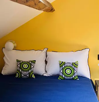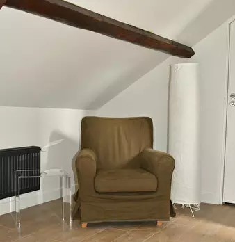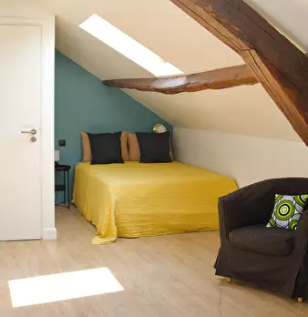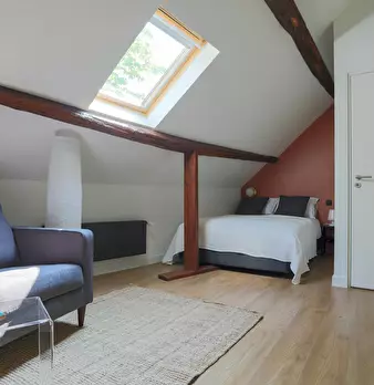 Chambre #9 - Maison principale 2ème étage, chambre mansardée spacieuse et claire avec salle de bain (lavabo, douche) et WC privatifs – 21 m2 au sol, 12 m2 carrez, lit 140X190, chevet, bureau, chaise, fauteuil, table basse, luminaires, espace dress...