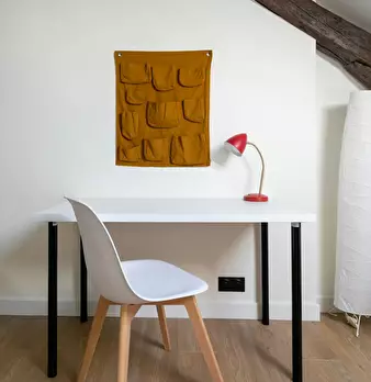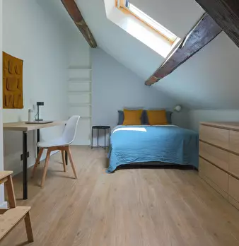 Chambre #11 - Maison principale 2ème étage, chambre mansardée – 16 m2 au sol, 13 m2 carrez, lit 140X190, chevet, bureau, chaise, fauteuil, espace dressing, salle de bain (douche, lavabo, WC). Super coliving dans grande maison meublée avec jardin...
