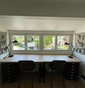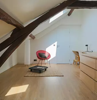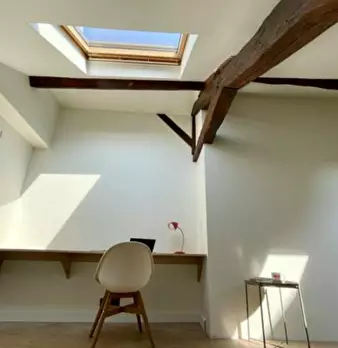 Chambre #12 - Maison principale 2ème étage, chambre mansardée – 29 m2 au sol, 15 m2 carrez, lit 140X190, chevet, bureau, chaise, fauteuil, espace dressing, salle de bain (douche, lavabo, WC). Super coliving dans grande maison meublée avec jardin...