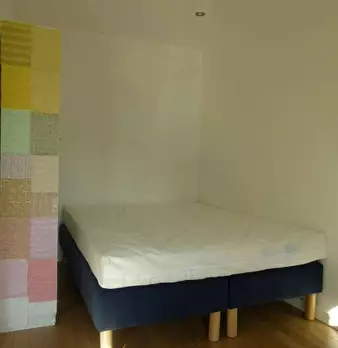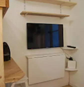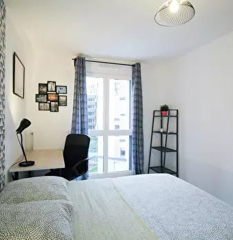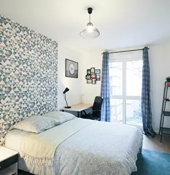 Grande chambre de 15m2, entièrement meublée. Elle dispose d’un lit double (140x190) accompagné d'une table de chevet avec lampe. Un espace de travail est disponible, composé d'un bureau avec chaise et lampe. La chambre propose également plusieurs ...