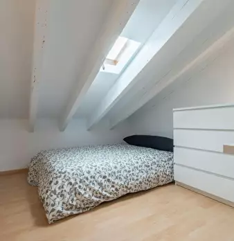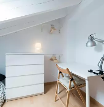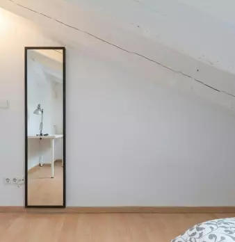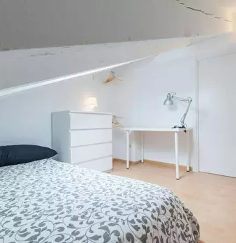 Habitación en piso compartido de estudiantes. Dormitorio abuhardillado con cama doble, escritorio y armario (tal y como aparece en la foto). El apartamento cuenta con una inmensa terraza de uso privado. El AC funciona con monedero. Situado a 2 min...