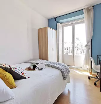 iRent Madrid alquila habitación en piso compartido de estudiantes en Chamberí, junto a Metro Argüelles, en piso de 150 metros. La habitación consta de una cama individual, armario grande, escritorio con silla y mesilla de noche. El piso consta d...